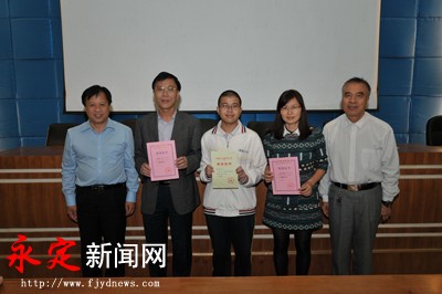 近日,在永定一中階梯教室舉行頒獎儀式。該校高三(9)班蘇頌同學在2015年第29屆化學奧林匹克競賽(初賽)中榮獲一等獎,永定一中及一中校長分別獲得優秀組織單位獎和優秀組織個人獎,省化學會秘書長、廈門大學教授陳毅輝及廈門大學教授、一中校友李慶水親自前來頒獎。