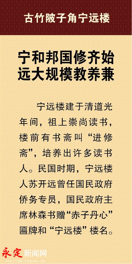 ——古竹陂子角寧遠樓大門對聯。寧遠樓建于清道光年間,祖上崇尚讀書,樓前有書齋叫“進修齋”,培養出許多讀書人。民國時期,寧遠樓人蘇開遠曾任國民政府僑務專員,國民政府主席林森書贈“赤子丹心”匾牌和“寧遠樓”樓名。