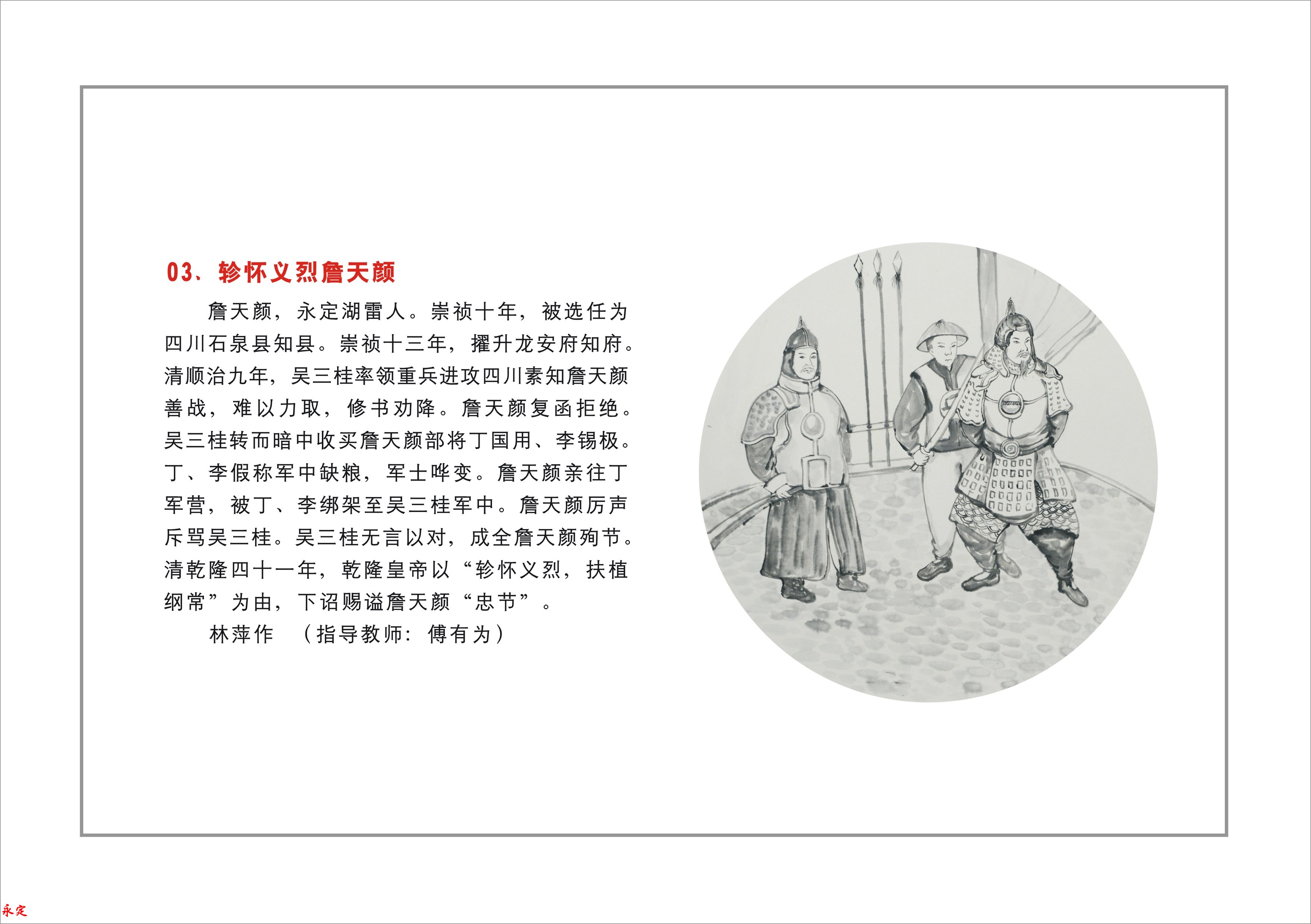 詹天顏,永定湖雷人。崇禎十年,被選任為四川石泉縣知縣。崇禎十三年,擢升龍安府知府。清順治九年,吳三桂率領重兵進攻四川,素知詹天顏善戰,難以力取,修書勸降。詹天顏復函拒絕。吳三桂轉而暗中收買詹天顏部將丁國用、李錫極。丁、李假稱軍中缺糧,軍士嘩變。詹天顏親往丁軍營,被丁、李綁架至吳三桂軍中。詹天顏厲聲斥罵吳三桂。吳三桂無言以對,成全詹天顏殉節。清乾隆四十一年,乾隆皇帝以“軫懷義烈,扶植綱常”為由,下詔賜謚詹天顏“忠節”。