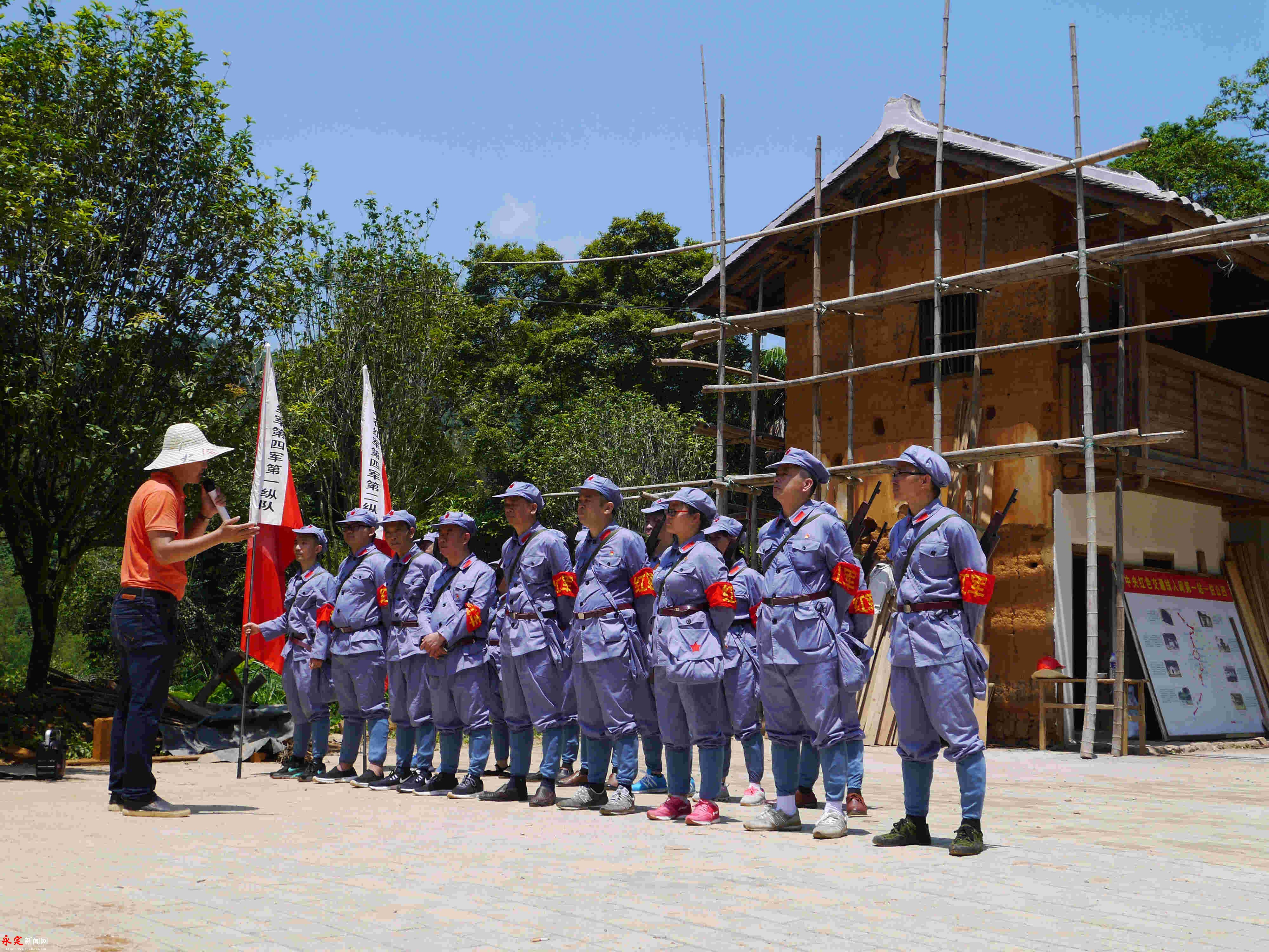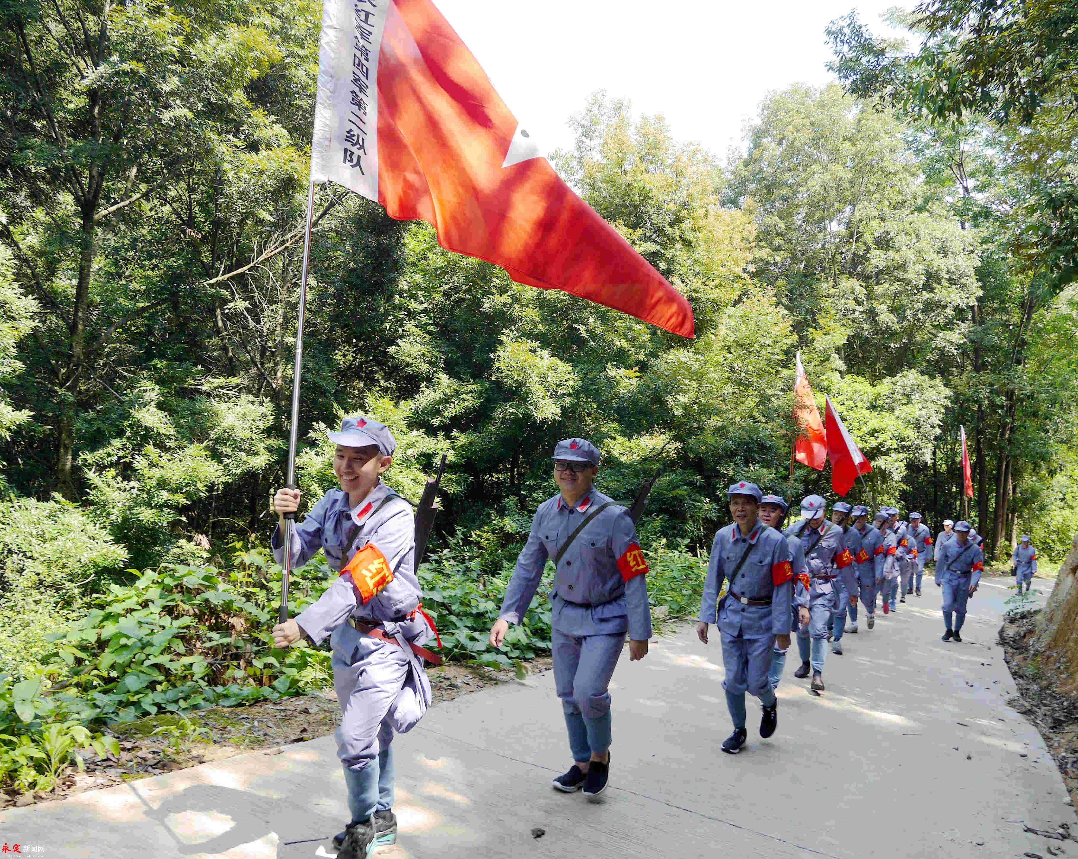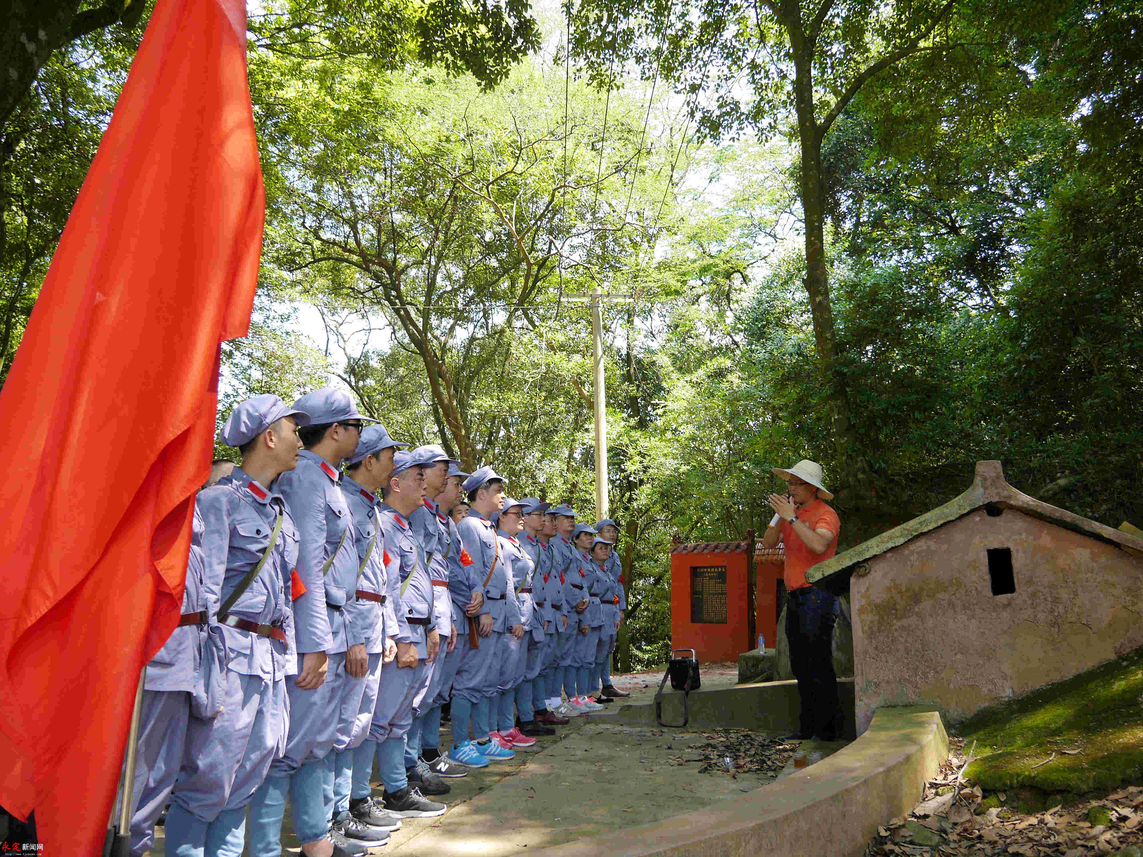 重走紅色交通線。劉永良 攝 在伯公凹,黨員們頂著炎炎烈日,身著紅軍服,頭戴八角帽,高舉“閩西工農紅軍第四軍第一縱隊”“閩西工農紅軍第四軍第二縱隊”的軍旗,行走在崎嶇的山路,重走紅色交通線,追尋老一輩足跡,重溫那段不能忘卻的歷史。“因為秘密工作的緣故,不少人名姓不詳,英名埋沒于青山,成為無名英雄。是什么,讓他們如此堅定?是什么,讓他們如此無畏?是什么,讓他們獻出生命也在所不惜?”在山間古道,黨員們邊走邊思考:“除了紅色的信仰,還能有別的什么力量?” 在交通站舊址前,參加活動的黨員整齊列隊,在區(qū)委常委、宣傳部部長曾佑繁的帶領下,面對鮮紅的黨旗,舉起右手、握緊拳頭,重溫入黨誓詞,牢記共產黨員的責任和使命。同時,在伯公廟、交通站舊址前,黨員們用心聆聽烈士后代鄒廣敦講解了一個個驚心動魄而又令人肅然起敬的感人故事,回顧烽火連天的革命歲月,深刻緬懷革命先烈的英雄事跡和豐功偉績。