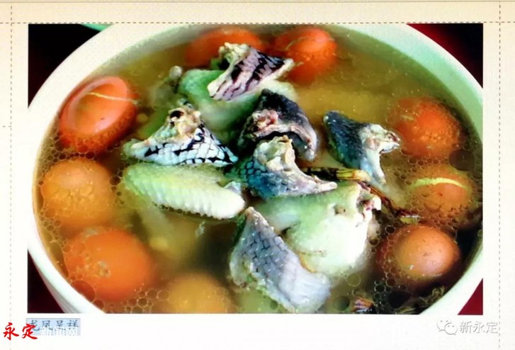 視頻加載中...  原料 蛇段 1000 克,雞蛋 10 粒,蟶干 150 克,涼雞湯 1500 克,精鹽12 克,酒娘少許。 做法 1.蛇段洗凈,斬成 3 公分長段,置鍋中隔水蒸至斷生,出鍋晾涼,用小竹絲捅去骨髓。雞蛋洗凈,蟶干洗凈水發軟。 2.全部食材放入大湯盆,置蒸籠旺火蒸 3 小時,出籠上席。 相關的話 ★ 蛇段要捅去骨髓,否則,人吃了腋下會出黃汗。 ★ 土樓山區蛇類資源十分豐富,深山有大蟒,樹上有青竹絲,溪河中有水節杠(銀環蛇),池塘里有泥蛇……“七月蛇攔路,八月蛇上樹”,甚至房前屋后也常能看見蛇活動。因此人被蛇咬傷的事件時有發生,加之“農夫和蛇”的傳統教育,客家人把蛇類視為來自自然界的敵人,也就不足為怪了。故有“見蛇不打三分罪”之說,并以食之而后快!不過,蛇肉鮮美,清涼解毒,這才是好吃蛇的真正原因。 據說世界上最早的味精,就是用蛇提煉的。從前,客家人烹蛇是不能在家中進行的,說是蛇香會把蜈蚣引進屋,以致引得蜈蚣從瓦縫中鉆出把口水吐進蛇鍋而毒死人。所以,每當有人抓到蛇,就在曬谷坪或空曠的地方,用石頭支起鍋烹煮。這時同自然村的很多人都會圍過來。蛇煮好了總不能只自己吃,可要分給大家,一人一口湯也分不到啊,怎么辦?只得多加些東西去煮,可加什么呢?正好有人手中拿著雞蛋,那就加雞蛋吧。于是,每人一個,大家都回去拿。蛇煮好了,在場的都有得吃,捕蛇者吃蛇,圍觀者吃蛋,眾人有福同享,人人眉開眼笑,一派其樂融融。說來也怪,這么一條蛇,一般也就是二三斤重,煮一大鍋水,還放二三十個帶殼的雞蛋,很多營養成分都被雞蛋吸進去了:蛋白特別嫩,蛋黃變成了灰褐色,吃起來特別香。而蛇肉蛇湯仍是那么鮮!所以這道美味能在今天的餐桌上出現是很自然的事情。當然,上了大雅之堂,就得給取個響亮的名字:蛇段在鮮湯中若隱若現,恰以蛟龍出海。 客家人愛雞就把雞說成了鳳,雞由蛋出,蛋由雞生。那行,蛋也是鳳,就叫“龍鳳呈祥”吧。可惜,今天在席面上吃到的這款佳肴,顏色和味道都大不如前了,因為這蛇是人工飼養的! |