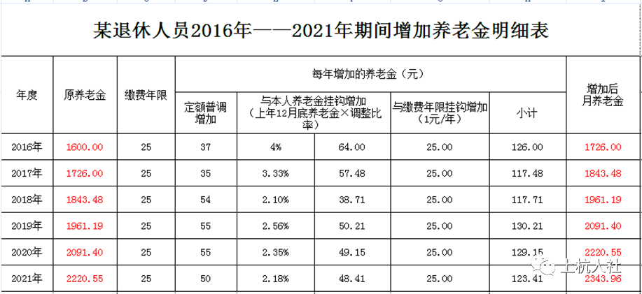 例2:我市退休人員黃某2015年1月退休,月領取養老金1600元、繳費年限25年,2016-2021年6年調整待遇共增加743.95元,2021年養老金為2343.96元。具體調整明細見下表: