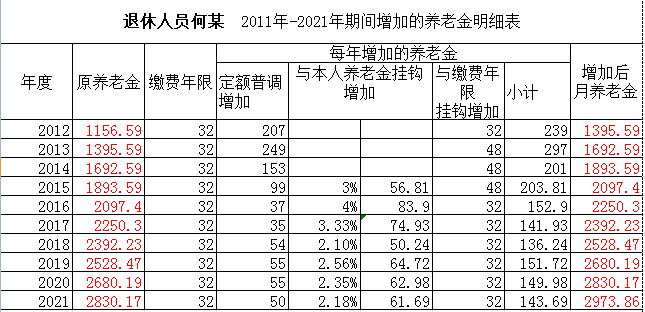 例3:我市某退休人員何某2011年8月退休,月領取養老金1156.59元、繳費年限31年7月,2012-2021年10年調整待遇共增加1817.29元,2021年養老金為2973.88元。具體調整明細見下表: