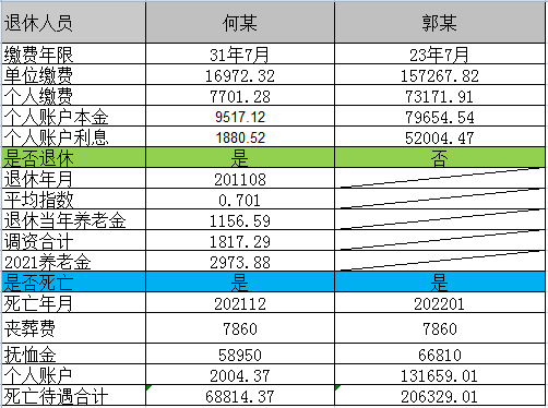 退休人員待遇調整與其繳費年限和養老金標準掛鉤,繳費年限越長,養老金越高,調資增幅越大。 八、政府兜底子,領取一輩子。2022年政府工作報告提出,穩步實施企業職工基本養老保險全國統籌。全國統籌制度實施后,社會保險基金在全國范圍內互濟余缺,將有利于進一步提升保障能力,更好地確保養老金按時足額發放。企業職工(含個體工商戶、自由職業者、靈活就業人員)按現行繳費標準測算,參保人員的全部繳費在退休后短短數年就全部領回去了,以后全部由政府無償發放養老金,而且養老金還逐年調漲,企業退休職工將享有與經濟發展水平相適應的養老保險待遇。 九、保障水平高,身后發撫恤。企業在職參保和退休職工因病或非因工死亡的,其遺屬可以繼承其個人賬戶,并領取喪葬補助金和撫恤金。喪葬補助金按參保人員死亡時本省上一年度城鎮居民月人均可支配收入的2倍發放。撫恤金標準區分在職人員和退休人員兩種情況。其中,在職人員以死亡時本省上一年度城鎮居民月人均可支配收入為基數,根據本人的繳費年限確定發放月數。繳費年限不滿5年的,發放月數為3個月;繳費年限滿5年不滿10年的,發放月數為6個月;繳費年限滿15年不超過15年的(含15年)的,發放月數為9個月;繳費年限15年以上的,每多繳費1年,發放月數增加1個月,繳費年限30年以上的,按照30年計算,發放月數最高為24個月。退休人員以死亡時本省上一年度城鎮居民月人均可支配收入為基數,根據本人在職時的繳費年限確定最高發放月數(計算方法與在職人員相同),每領取1年基本養老金減少1個月,發放月數最低為9個月。 例1:我市退休人員何某,繳費年限31年7月,2011年8月退休,退休時個人賬戶本息11397.64元。至2021年12月已累計領取養老金290402元,去世后家屬又可領取一次性待遇:喪葬費7860元、撫恤金58950元、個人賬戶余額2004.37元,死亡待遇合計68814.37元。何某累計享受的社會保險待遇為359216.37元。 例2:我市在職參保人員郭某,繳費年限23年7月, 2022年去世,去世時個人賬戶本息131659.01元。家屬可領取的一次性待遇有:喪葬費7860元、撫恤金66810元、個人賬戶余額131659.01元,死亡待遇合計206329元。