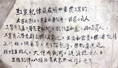 圖為1929年5月紅四軍書寫在龍巖市永定區坎市鎮裕源店的《三條紀律八項注意》內容。
