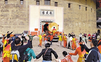 在永定土樓景區,大鼓涼傘、提線木偶、十番音樂、以及富有新春氣息的福祿壽、福多多人偶等趣味民俗活動熱鬧上演,來自全國各地的游客盡享世遺土樓美景,零距離感受客家文化的獨特魅力。