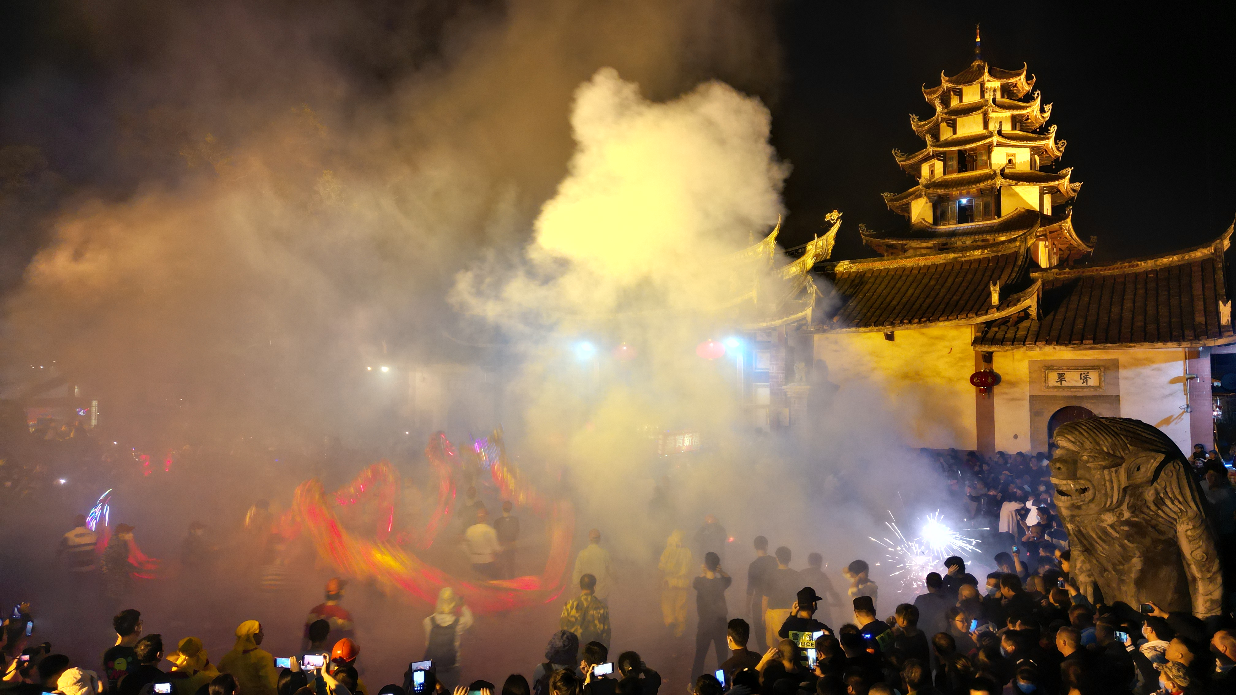一支支舞龍隊從四面八方匯聚于此,爭相勁舞,左右翻飛,漫天的硝煙和焰火,使整個西陂天后宮宛如仙境,來自各地的游客沉浸式體驗著客家傳統民俗文化的魅力。“確實是前所未有的熱鬧,特別激動。”應同事邀請到西陂做客的林先生被盛大的狂歡深深吸引了。