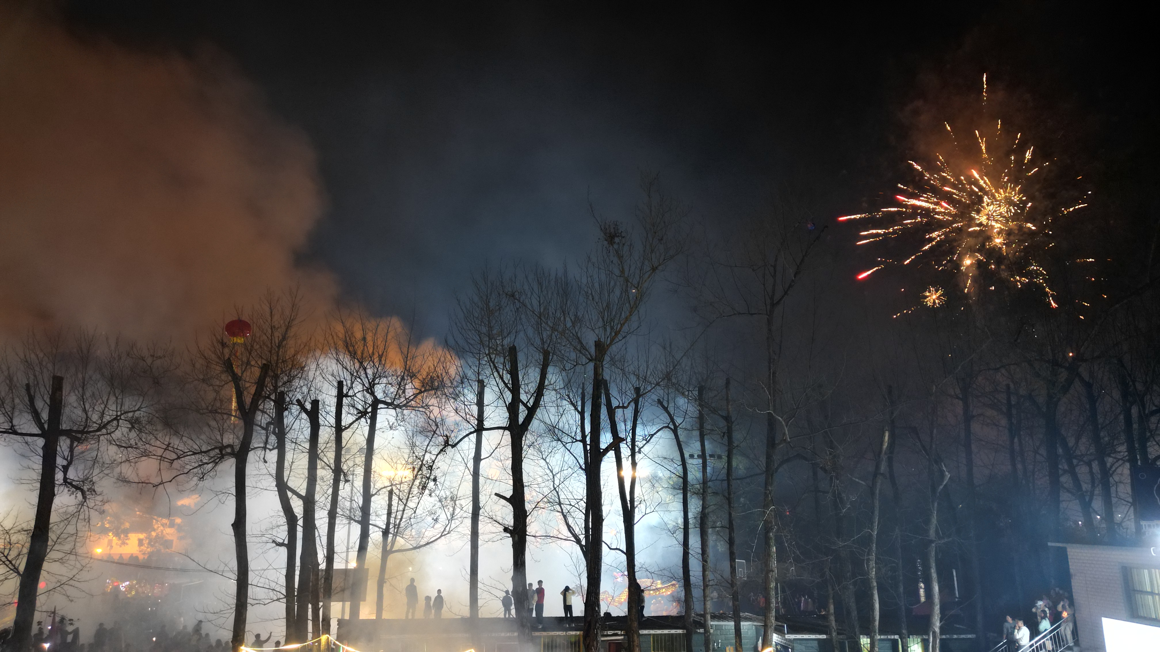 沒過多久,村里林姓各房龍隊都陸續到來。每一支舞龍隊伍的到來必定都是鑼鼓開道,并伴隨著震耳欲聾的鞭炮聲,三四個年輕人拉著點燃的串炮一路小跑,瞬間擁擠的人群分開一條通道,讓龍隊進入。