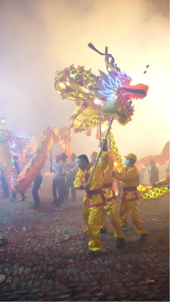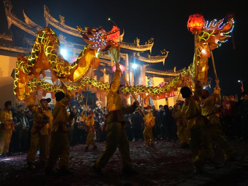 正月十五鬧宗祠,十六鬧親房,十七鬧天后宮,是永定區高陂鎮西陂村傳統鬧元宵的特色。據說,天后宮舞龍鬧元宵已有400多年的歷史。最高峰時各房各支各堂可出到36條龍,今年元宵是近3年最鬧的,出了25條龍,歡慶的鑼鼓、騰飛的舞龍,村民們以此來企盼新春的生活越來越好。“這幾年來,我們的西陂村古建筑保護起來了,旅游也搞得有聲有色。”村里從事旅游業的林華新表示,新的一年里,要和村民一起,在鄉村振興的路上,把家鄉建設得更加美好。