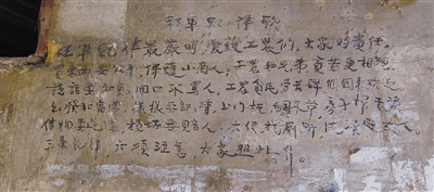 為了讓紅軍鐵紀(jì)“三大紀(jì)律八項(xiàng)注意”宣傳深入人心,紅軍部隊(duì)不僅把它編印成宣傳教材,還將它作為標(biāo)語書寫在墻上,并且譜寫成歌曲廣為傳唱。1929年5月19日,毛澤東和朱德率領(lǐng)紅四軍第二次入閩,正式創(chuàng)建了閩西革命根據(jù)地。5月23日紅四軍攻占永定縣重要集鎮(zhèn)坎市后,紅四軍宣傳隊(duì)立即在坎市新街街頭張貼《紅四軍司令部布告》,宣傳紅軍的宗旨,并在朱德住處裕源店三樓廳墻上寫下《三條紀(jì)律八項(xiàng)注意》歌。這幅標(biāo)語是目前發(fā)現(xiàn)最早反映“三大紀(jì)律八項(xiàng)注意”的文字記載,但令人遺憾的是,由于1988年的一場洪水將裕源店損毀,這件珍貴的紅色文物已不復(fù)存在。