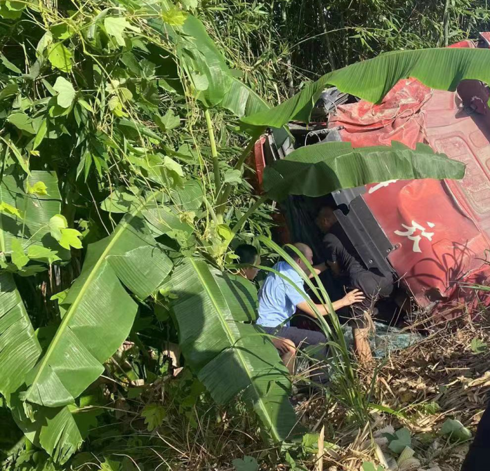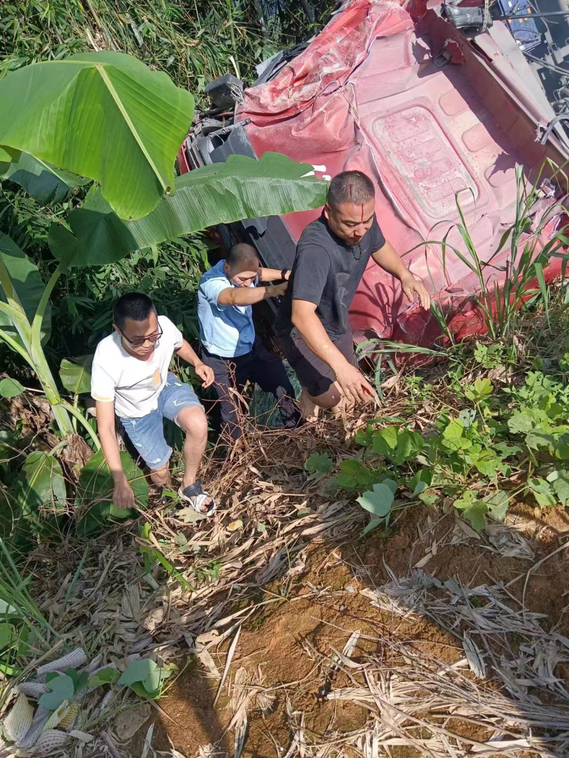 “快,先救人要緊,大家幫忙!”執法人員見狀,立即沖向駕駛室位置,焦急地詢問:“師傅,你怎么樣了?人有沒有事,能不能動?”司機表情痛苦摸著頭部說:“人清醒,還能動,頭部和手腳受傷了,有點痛。”得知駕駛員的受傷情況后,執法人員一邊撥打110、120電話請求支援,一邊合力徒手掰開樹枝和阻擋物,積極展開營救,一些熱心群眾也加入了營救工作當中。