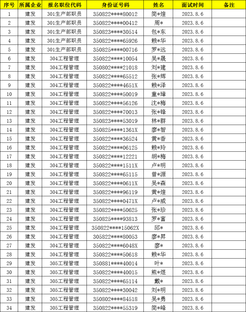 視頻加載中... 根據(jù)《龍巖市永定區(qū)區(qū)屬國企公開招聘工作人員公告》和《龍巖市永定區(qū)區(qū)屬國企公開招聘工作人員補充公告》,經(jīng)福建客家建設發(fā)展集團有限公司資格審查,現(xiàn)將職位代碼301、304、305崗位面試相關事宜通知如下: 一、面試原則 貫徹公開、公平、競爭、擇優(yōu)的原則;突出針對性、實用性、科學性和靈活性;加強紀律、監(jiān)督,注重保密工作;充分發(fā)揮面試對應聘者全面素質的評價作用。 二、面試對象 經(jīng)資格復核符合報考條件人員,詳見《龍巖市永定區(qū)區(qū)屬國企公開招聘工作人員面試名單(301、304、305崗位)》(附件)。 三、面試時間、地點 時間:2023年8月6日 地點:永定賓館行政樓(龍巖市永定區(qū)鳳城街道體育路36號) 四、面試內容 面試采取結構化面試。 五、注意事項 1.面試順序。參加面試人員在規(guī)定的時間內到面試地點報到后,須聽從工作人員的安排,按規(guī)定簽到,上交手機(關機)及違禁物品,由工作人員組織抽簽決定面試順序,面試順序一經(jīng)抽取不得更改或調換。 2.考場管理。面試考場實行封閉管理,參加面試人員中途不得離開考場,隔絕與外界的聯(lián)系。 3.考生必須在規(guī)定的時間內,憑本人有效居民身份證到面試地點報到(考生報到時間:7:30-8:00),8:00后不得進入考點參加面試,視為棄權。 4.考生嚴禁攜帶各種無線通訊工具、電子存儲記憶、錄放設備等物品進入考試場所,一經(jīng)發(fā)現(xiàn),取消面試資格。 5.考生必須服從工作人員的管理,聽從工作人員的引領,依抽簽順序到指定的面試室參加面試;在面試過程中,只能以面試抽簽號出現(xiàn),不得向評委透露個人其他任何信息,否則取消面試資格,面試成績按零分計算。 6.面試成績由評委當場打分,去掉一個最高分,去掉一個最低分,取平均分(保留兩位小數(shù)),當場宣布考生成績。面試成績于招聘面試結束后,在“永定新聞網(wǎng)”網(wǎng)站(http://www.lndkjfwzx.com/)公布。 7.考生面試結束后,應立即離開面試場所,不得在考場逗留,不得再進入候考室、考室與未面試人員交流,違者一經(jīng)發(fā)現(xiàn),取消面試成績。 附件:龍巖市永定區(qū)區(qū)屬國企公開招聘工作人員面試名單(301、304、305崗位)
