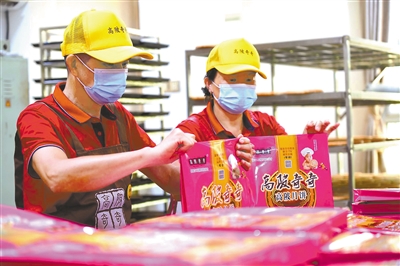 蔡壯偉夫妻忙著給完成烘烤后的月餅裝袋壓膜 這段時間,大批量的月餅訂單,常常讓工人師傅們從天亮忙到天黑,又從天黑忙到天亮。“我們的月餅油和水比例適當,餅皮才能柔軟,從選料到打餅、烘烤等20多道工序,每一道工序都不能有半點的馬虎。” 蔡壯偉說,“在傳統月餅制作過程中,我們既保留了傳統的餡料、和面方法,又利用現代化的烘焙和包裝技術,讓月餅保留了傳統味道,又延長了保質期,所以深受消費者喜歡。”
