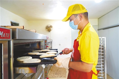 師傅們把烤箱中的月餅翻面 蔡壯偉有著40多年的老手藝,雖年近六旬,但和面、拌餡、搟皮、壓餅……他的動作依舊麻利、嫻熟。蔡壯偉告訴筆者,制作傳統手工月餅,每一個環節都大有講究,月餅的味道和賣相全憑手工師傅的一雙巧手,從一團面粉到噴香的月餅,一個手工月餅耗時約3至4個小時。