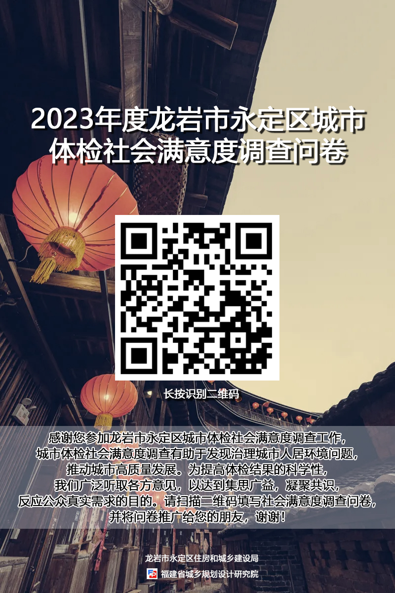 視頻加載中... 隨著永定區經濟社會的快速發展,交通擁堵、公共資源緊張、公共安全弱化等一系列“城市病”日益顯現,對群眾的生活和城市的運轉產生明顯影響。 根據省住房城鄉建設廳關于開展城市體檢工作的相關要求,永定區將通過數據分析、專家咨詢、公眾意見征集等方式開展城市體檢。 對城市進行年度“體檢”,就是全面了解群眾對永定區人居環境質量的滿意度,查找群眾感受到的突出問題和短板,針對存在的“城市病”提出“診治”方案,對容易產生的“城市病”提出預防措施,從而促進城市健康發展。 為判斷城市綜合發展水平,查找存在的問題和短板并分析原因,提出有效緩解“城市病”、促進城市高質量發展的對策,我們將從房子開始,到小區、社區、街區、城區等5個層面,找出群眾反映強烈的難點、堵點、痛點問題,對城市進行客觀分析評價,加快轉變城市發展方式,著力治理“城市病”,全面推動城市高質量發展。 居民朋友們,推動我們居住的城市高質量發展,你的聲音很重要!龍巖市永定區住房和城鄉建設局精心準備了一份《2023年度龍巖市永定區城市體檢社會滿意度調查問卷》,誠邀您一起為城市健康發展把脈問診、建言獻策。請你掃描二維碼,進入問卷并填寫,問卷填寫截止時間:2023年11月10日。