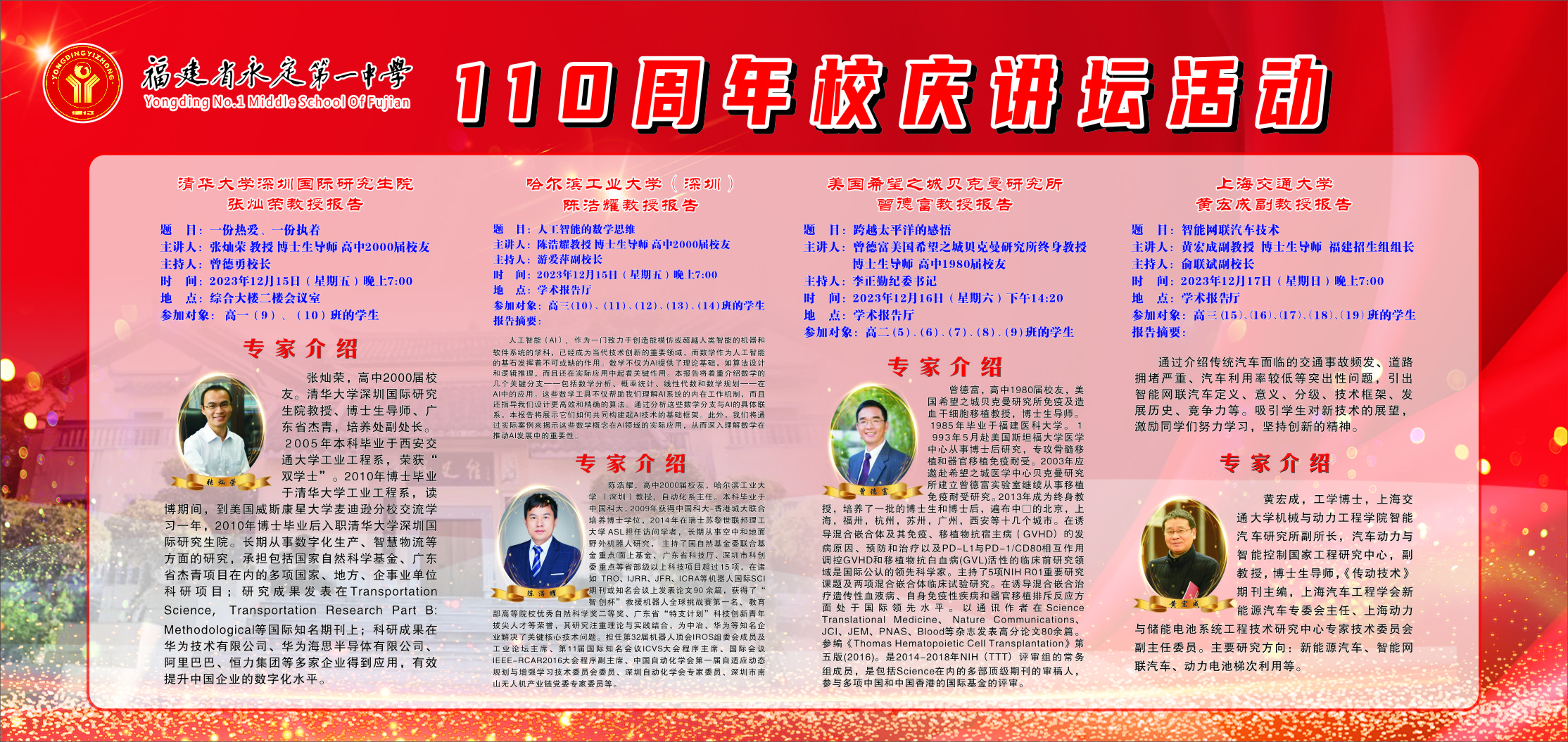 視頻加載中... 永定新聞網訊(劉永良/文 熊 川 江 舲 湯浩宇 湯勝新/圖)韶光流轉,含英毓秀,百年崢嶸又一十;四海共情,盛事如約,弦歌不輟譜新篇。12月17日,永定一中舉行建校110周年慶祝大會。清華大學、北京大學等全國多所高校發來賀信;國防大學戰略研究所原所長賴銘傳將軍,第十四屆全國人大代表、高級工程師、萬華化學集團黨委書記、董事長廖增太,中紀委駐住建部紀檢監察組原副組長盧海斌,福建省紀委監委原副廳級紀檢監察專員盧榮茂,市人大常委會原副主任余麗明、蘇立波,市政府原副市長張斯良等校友和嘉賓出席。龍巖市人民政府副市長修洪出席并講話,永定區委書記李強致辭,永定區委副書記、區長李宏泰主持,鄭煌泰、陳昌等在家區領導參加。 受龍巖市委、市政府委托,修洪向永定一中全體師生員工、廣大校友表示誠摯的祝賀!向長期以來關心支持龍巖教育事業發展的各界人士表示衷心的感謝!她說,110年來,永定一中始終弘揚紅土精神,堅持立德樹人根本任務,堅守“誠實、勤勉、精業、報國”的校訓,弘揚“勤、嚴、實、勇”的校風,培養出了一批又一批的革命先賢、學界名流、業界翹楚,為閩西的經濟社會發展、為祖國的繁榮昌盛貢獻了智慧和力量。希望永定一中牢記為黨育人、為國育才的初心使命,以110周年校慶為新的起點,加強教學管理,提升教學質量,辦好人民滿意的教育。 李強指出,永定加快振興發展、高質量發展,開創美好未來,迫切需要人才的強力支撐,迫切需要教育事業的全面發展。希望永定一中全面貫徹黨的教育方針,秉承優良校風學風,弘揚改革創新精神,努力把學校建設成為高質量有特色的卓越高中和人才輩出的搖籃。 會上,龍巖市教育局局長王傳龍宣讀了龍巖市委、市政府和省教育廳賀信,永定一中校長致歡迎辭,校友代表、學生代表分別進行發言。 慶祝大會前,與會領導、嘉賓參觀了永定一中校史館和社團活動,開展了校慶環城火炬接力和多場校慶講壇。活動當天,還舉行了“鳳凰翱翔·禮贊百十”永定一中110周年校慶文藝演出。 昔日桃李芬芳,今日碩果累累。辦學110年來,永定一中培育了5萬多名優秀畢業生,走出了中科院院士盧衍豪、中國人民解放軍少將賴銘傳、今日頭條張一鳴等杰出校友。今年,學校高考本科上線率98.5%,錄取清北4人,錄取“雙一流”大學人數大幅提升。