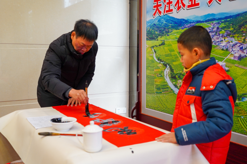 活動現場,文化志愿者們揮毫潑墨,筆落字現。“福氣降臨闔家福,春光輝映滿堂春”“碧海驚濤龍獻瑞,蒼梧茂葉鳳呈祥”“和氣致祥家富貴,厚德載福人安康”……一副副帶“福”的“三農”春聯筆力遒勁、寓意美好,散發著濃濃墨香,展示中國傳統“福”文化的魅力,展現了新時代新農村文明和諧的新風尚。