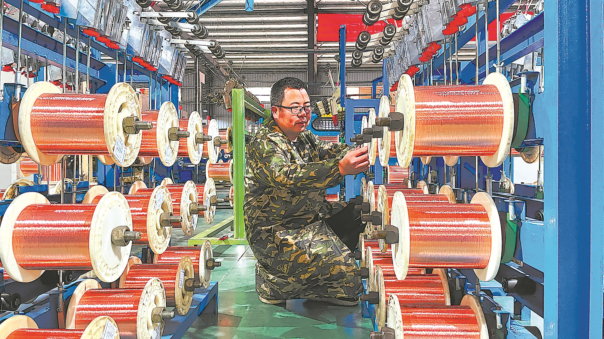 連日來,在永定工業(yè)園區(qū)的互寬光電有限公司生產(chǎn)車間,各條生產(chǎn)線開足馬力忙著趕制訂單。該企業(yè)2023年產(chǎn)值超過1.2億元,新的一年訂單量已經(jīng)排到年底,預(yù)計產(chǎn)值可突破1.5億元。圖為該企業(yè)工人正在絞銅機上作業(yè)。