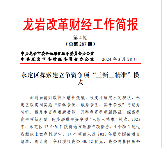 永定區探索建立爭資爭項“三新三精準”模式在全市推廣 近日,由市委深改辦和市委財經辦主編的《龍巖改革財經工作簡報(第4期)》刊發了區發改局提供的《永定區探索建立爭資爭項“三新三精準”模式》的典型做法,爭資爭項工作經驗獲全市推廣。各級各部門要進一步加強學習,強化爭資爭項工作,切實按照區委、區政府關于加強項目策劃儲備及向上爭取資金的有關工作要求,緊緊抓住國家支持革命老區振興發展的重大機遇,積極研究政策、精準策劃項目、努力爭取資金,為推進我區革命老區振興發展、高質量發展提供堅強保障。 服務企業“有溫度”項目落地“有速度” 日前,廣藥王老吉(龍巖)產業園(永定)生產基地項目建設現場一派熱火朝天。據悉,去年9月簽約以來,在區相關部門的通力協作下,該項目順利開工。今年4月所有基建工程進場施工,預計今年10月可實現投產。 “這得益于永定‘拿地即開工’和服務企業‘幫代辦’利好政策,同時,永定各級各部門在要素保障方面也非常到位。僅幾個月的時間,‘三通一平’的問題全部解決,并幫我證件全部辦理下來,整個過程都是‘媽媽式’服務。”廣藥王老吉(龍巖)產業園(永定)生產基地項目負責人杜浩文連連稱贊。 廣藥王老吉(龍巖)產業園(永定)生產基地項目由廣藥集團廣州王老吉大健康產業有限公司與福建福天食品有限公司合作建設,總投資2.2億元,新建廠房、倉庫、配套輔房、綜合辦公區、廠內道路、綠化等配套工程和布局2條高度自動化生產的灌裝生產線,主要生產灌裝王老吉飲料等系列產品。項目建成后,可解決80名勞動力就業。 “企業吹哨,部門報到,只要企業有需求,我們園區立馬就安排工作人員前去解決。”永定工業園區管委主任蘇玉鑄說。 為“永定服務”點贊的還有永定區TFT-LCD顯示模組生產項目負責人明庭銳。“政務服務走心,企業發展有信心。”他說:“2023年9·8廈洽會簽約以來,從項目落地到建設,區相關部門就采取了‘一企一策’,在注冊、環評等申報上給予積極支持,讓企業能夠集中精力投入工程建設。” 永定區TFT-LCD顯示模組生產項目,由龍巖市京龍達光電科技有限公司投資建設。總投資5.2億元,建設6條TFT-LCD顯示模組生產線,年產TFT-LCD顯示屏系列產品1000萬套以上。計劃4月上旬設備進場安裝并調試,并于5月份正式投產運營,力爭在2024年8月前上規。項目全面投產后,將實現年營收4億元以上,年繳納稅收1000萬元以上,具有良好的經濟效益和社會效益。 “今年一季度,永定區實現新簽約招商引資項目11個,總投資13.57億元,其中工業生產性項目5個,特色現代農業項目4個,文旅康養項目2個。新開工招商引資項目2個,總投資3.5億元。”區商務局局長賴梅添表示。 【鄉鎮(街道)、部門風采】