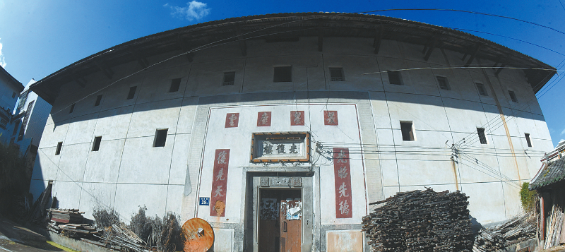 位于下洋鎮(zhèn)霞村一隅的光復樓始建于清宣統(tǒng)三年(1911年),是一座典型的客家土樓古建筑,外觀呈四方形,大門外有圍墻和水塘。土樓大門匾額上方的墻壁上,寫有“景星慶云”四個行書大字。大門左右兩邊分別寫著“光昭先德”“復見天心”的大字楹聯(lián),顯見建樓的主人氣度不凡。