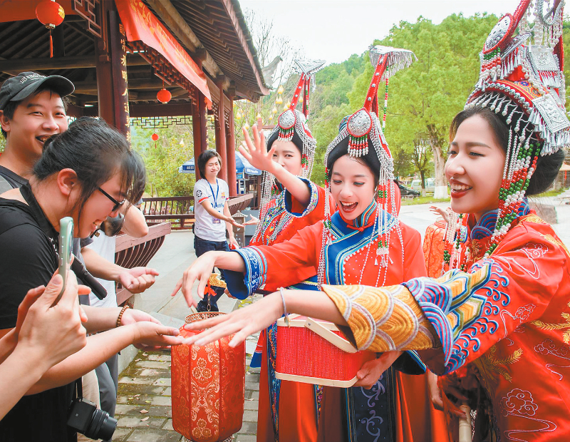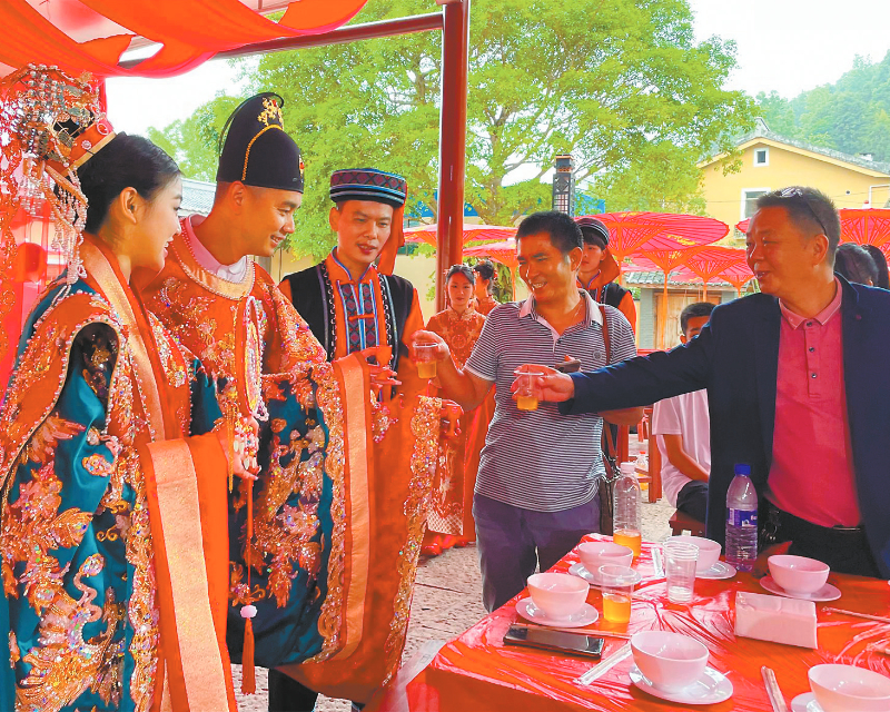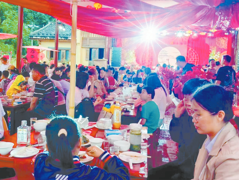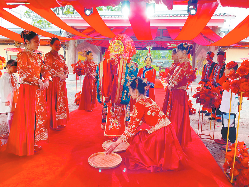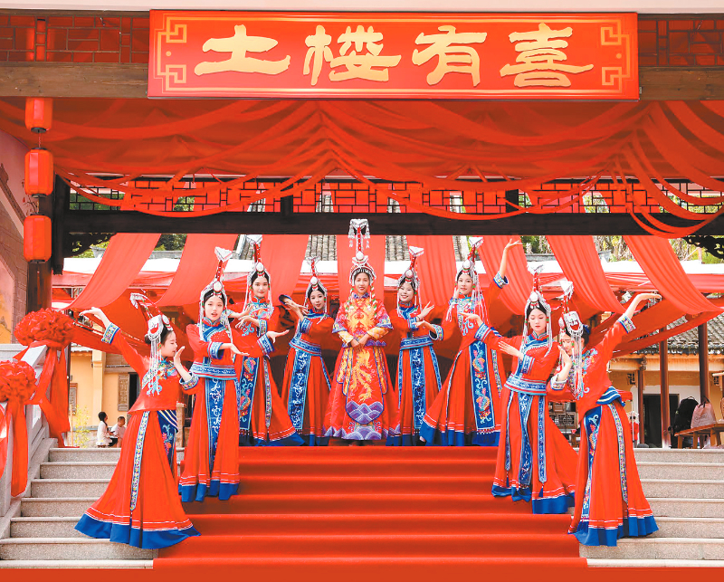 游客觀看土樓客家婚禮品嘗客家婚宴 ■ 黃秋萍 賴彬鐿 圖/文 日前,在土樓永定景區《土樓有喜》婚慶樓,一場別開生面的客家婚禮演出正在進行,吸引了不少游客參加。大家一起探秘客家婚禮,共同見證土樓有喜,喚起文化傳承的魅力。 “我們是第一次觀看客家傳統婚禮,真的很有意思,在這里不但可以看世遺土樓,體驗客家婚禮的習俗,感受客家婚禮與中式浪漫的獨特情調。”游客鄭女士表示,吃著客家美食,聽著客家山歌對唱,看著百年好合婚禮秀和吉言獻祝福,同時還可以欣賞夜間土樓的獨特魅力和五彩斑斕的燈光秀,真的是不虛此行。 永定土樓是客家人在輾轉遷徙中,將中原古老的生土建筑技術發揚到極致的世界建筑奇跡。而永定客家人的迎娶婚禮別有風趣,《土樓有喜》融合了濃厚客家文化與傳統建筑美學的婚禮盛宴。在世界文化遺產——永定土樓的見證下,一對新人將舉行一場別開生面的婚禮演出。土樓以其獨特的圓形和方形結構象征著團圓與穩固,是中國東南地區客家人世代居住的家園,客家婚禮更是中式浪漫具體化體現。 客家婚禮習俗傳統而溫情,其中的“六禮儀式”向世人展示了一個民系獨特的形式,是追求“以我之名,冠你指間,一生相伴,一世相隨”美好幸福的過程,說親、定親、報日子和送聘金、盤嫁妝、接親與送親、拜堂與吃面、交杯酒。據了解,五一假期以來,為了讓游客更全面地感受客家土樓的魅力,永定土樓景區還推出了燈光秀、大鼓涼傘、十番音樂、提線木偶、舞龍、《天涯明月刀》沉浸式演出等互動性表演,展現了永定土樓獨特的民俗文化和濃厚的非遺氛圍,土樓景區新增了一批新業態——非遺美食街、肯德基、直升機空中看土樓等,讓游客們能夠全方位地感受土樓的魅力。 |