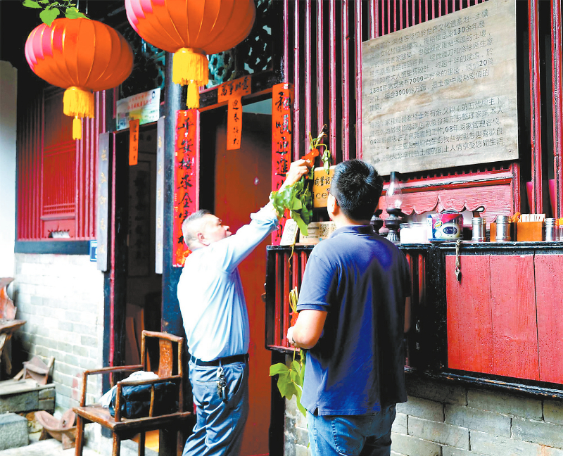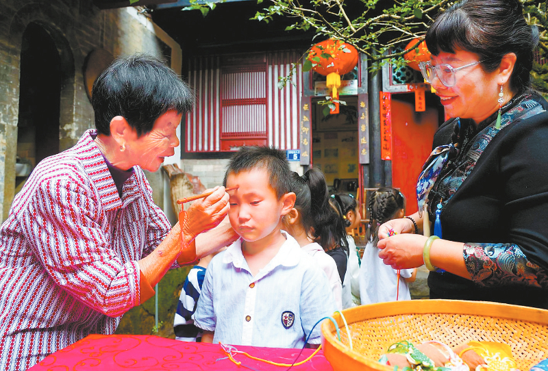 長輩給孩子們點朱砂 佩戴香包是端午節(jié)的傳統(tǒng)習(xí)俗之一,特別是小孩佩戴香包有避邪驅(qū)瘟、祈求健康平安的美好寓意。竹籃中,剛剛完成的香包小巧精致、色彩豐富,有三角形、小荷包形狀,小巧可愛,拿在手上,便能聞到一股淡淡的藥香。 “奶奶說,戴著這個香包就不怕蚊蟲叮咬了,又好看又好聞,我可喜歡這個香包啦。”土樓娃林語姍小朋友高興地說道。 端午節(jié)也是客家人的“衛(wèi)生節(jié)”。當?shù)氐拇迕窀嬖V記者,每年端午,家家都會在端午當天日出之前,灑掃庭院,在門上懸掛艾葉、葛藤、菖蒲等習(xí)俗,將懸掛數(shù)日的菖蒲、艾葉熬水,然后全家男女老少用這藥水洗浴。此俗至今尚存,據(jù)說可治皮膚病、祛邪氣。