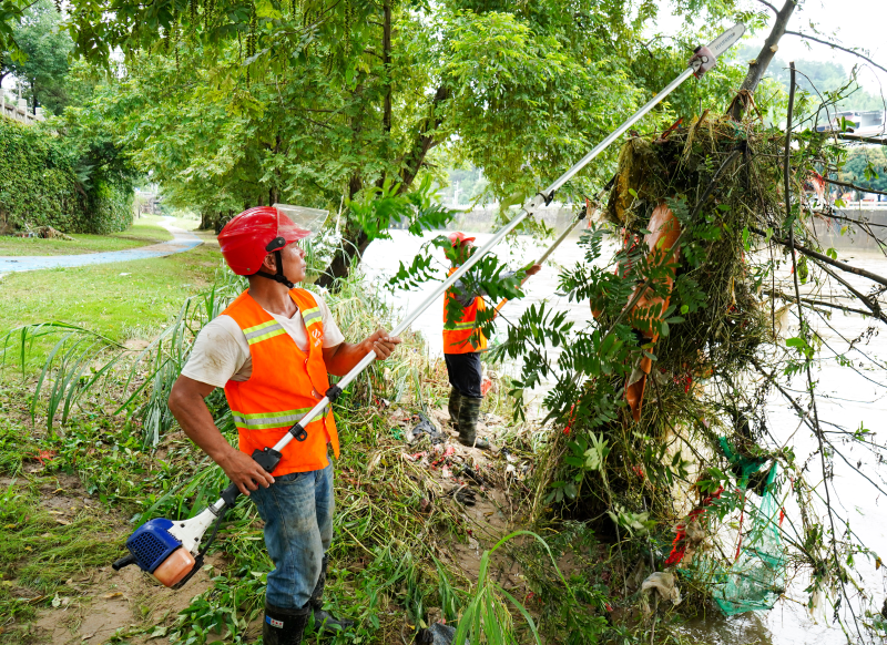 記者看到,河灘公園喬灌木掛滿垃圾而倒伏,厚重的淤泥沉積覆蓋公園。因此,區園林服務所黨支部召集黨員干部沖鋒一線,利用鐵鍬清理淤泥、鋤頭挖穴復墾、高枝剪清理掛樹垃圾,高壓水槍沖洗園路及硬質地面,已恢復河灘地綠化面積2萬余平方米,清理垃圾超過11噸,扶正倒伏樹50株,清洗園路1186米。