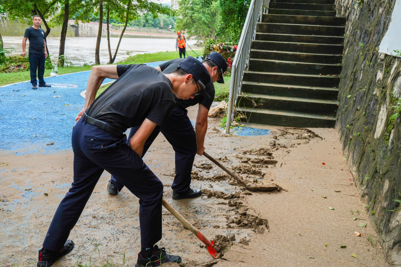 正在巡查的住建局干部熊萬仁說:“連日來,住建局組織黨員干部到一線對房屋體、河堤等建筑深入排查,將對城區已發現的2處坍塌河堤、14處建筑裂縫有序進行整改。” 受強降雨影響,永定河水位上漲,城區一部分河堤崩塌、臨河的公園部分區域被淹。在龍鳳社區河灘公園,區城市管理和綜合執法局、園林服務所、環衛所等單位40余名黨員干部,正在現場有條不紊地對河水漫灌淤泥垃圾進行清理、運載,當喬木掛枝塑料袋、草藤等垃圾清理干凈時,汗水浸濕大家的衣襟。