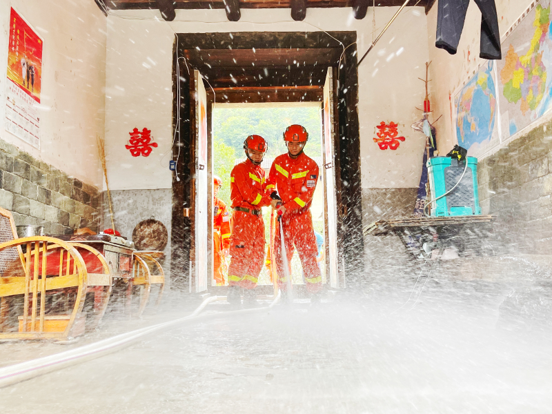 8月21日,在永定區湖坑鎮南中村,受暴雨影響,不少民房進水,淤泥堆積嚴重,福建省森林消防總隊龍巖支隊的27名除險馳援隊伍利用水槍、鐵鏟等工具,對民房堆積的淤泥進行全面清理,同時利用鏟車對塌方、溜方的村主干道進行清障。