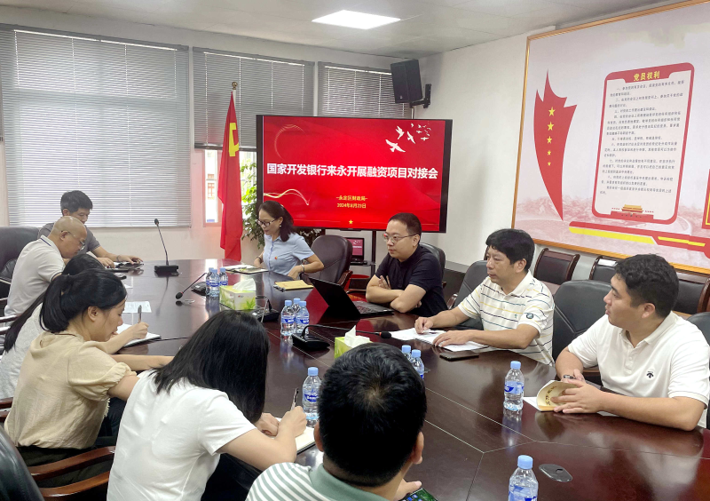 ▲ 8月23日,區(qū)財政局召開融資項目對接會,邀請國家開發(fā)銀行福建省分行三處經(jīng)理王澤宇就永定區(qū)對最新融資平臺置換經(jīng)營性債務(wù)政策等進行現(xiàn)場業(yè)務(wù)指導(dǎo),研究討論國有企業(yè)融資項目策劃工作。