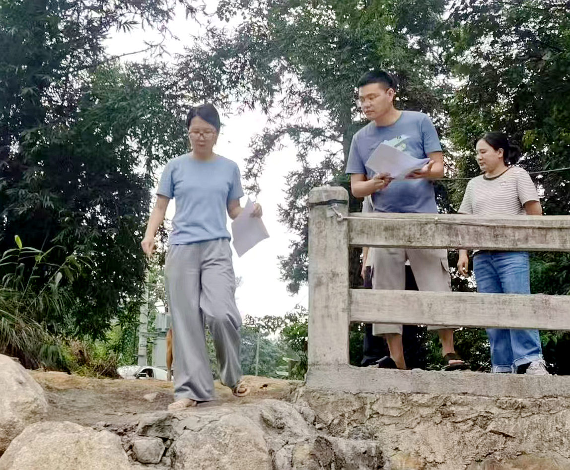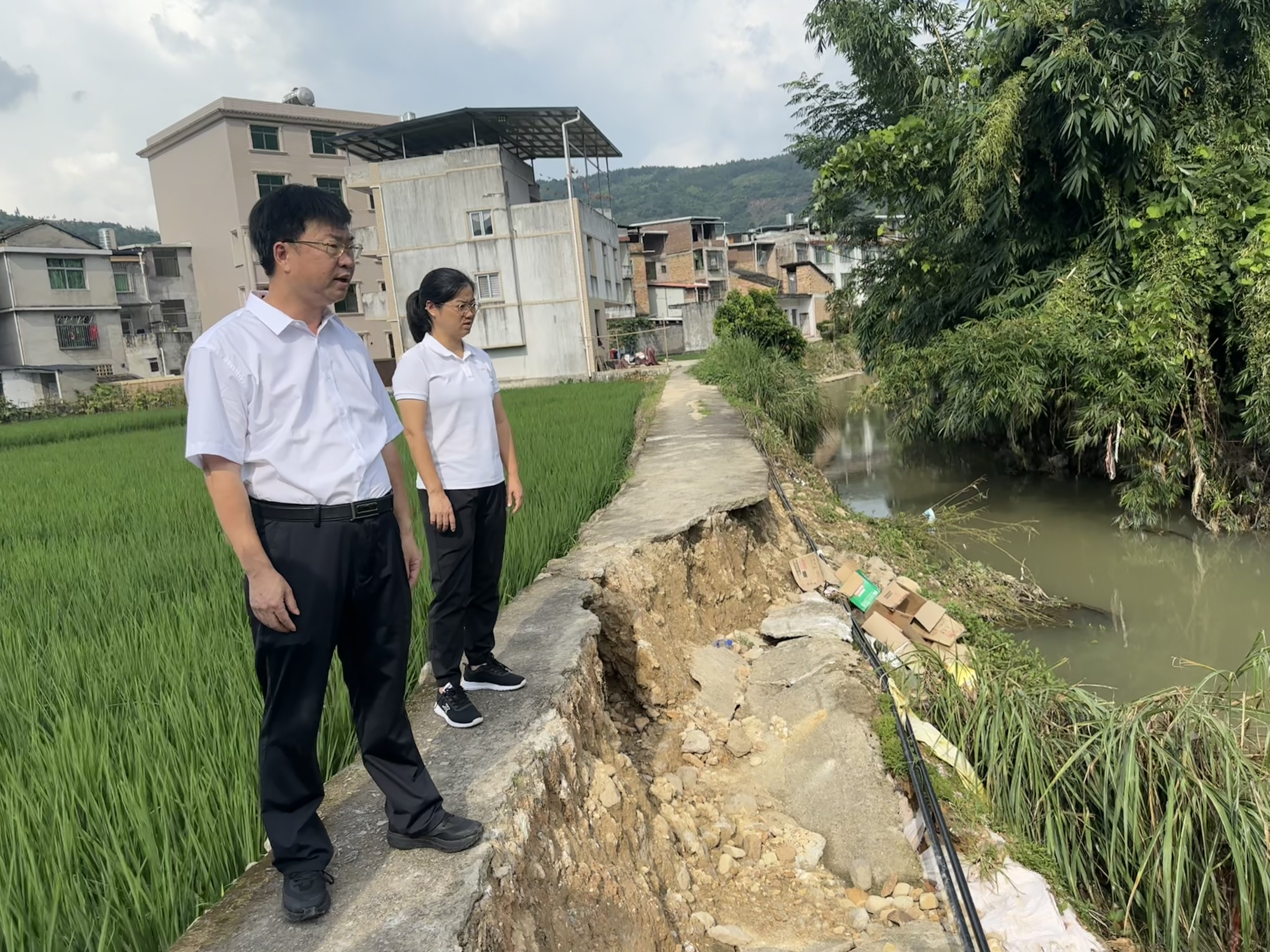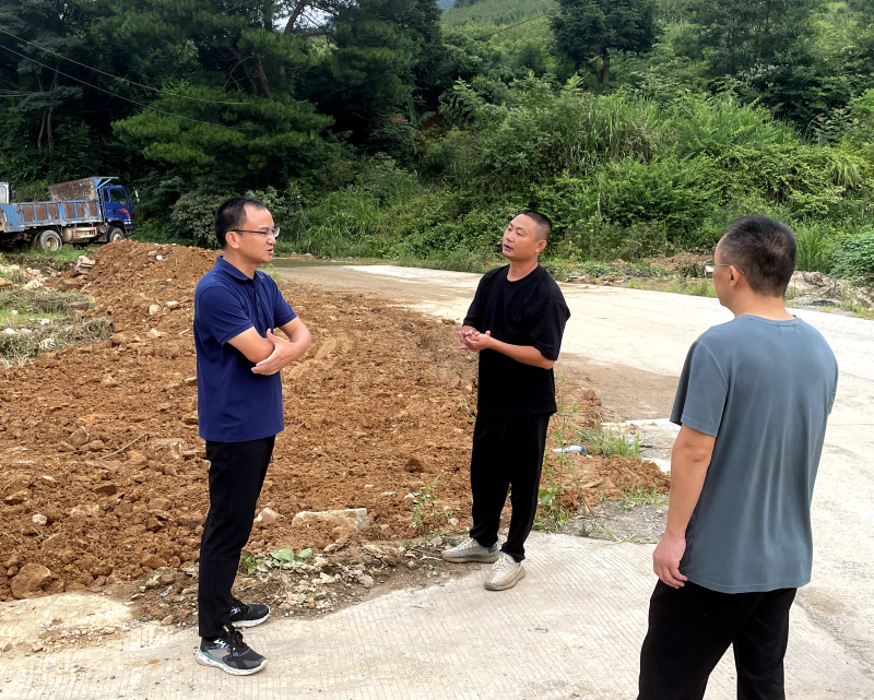 ▲ 8月28日上午,下洋鎮組織鎮村工作隊、項目業主前往思賢村推動國道白改黑項目工作,現場辦公協調解決問題。下午,指導災后重建工作,現場察看河堤、道路等受災情況,商議修復方案。