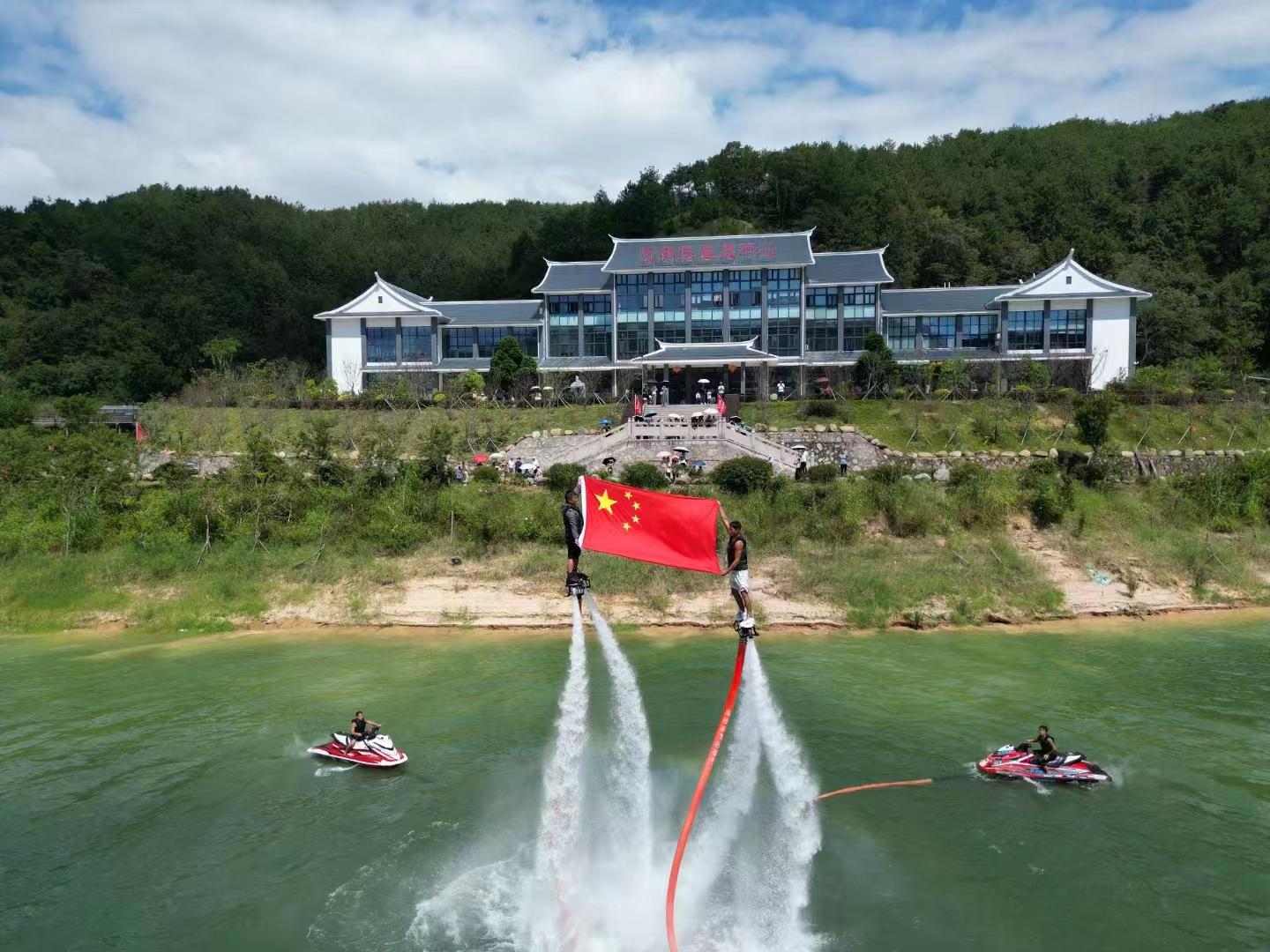 國慶期間,在龍湖景區,游輪、快艇掛上了鮮艷的國旗,特技演員手持國旗,腳踩噴射式懸浮飛行器一飛沖天,在水面上完成一個個高難度動作,帶給游人強烈的視覺沖擊。