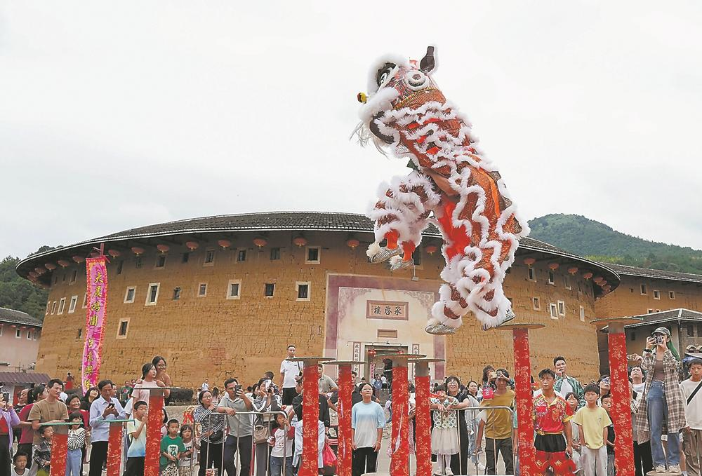 國慶期間,永定土樓景區人氣爆棚。傳統舞龍舞獅、曬秋、非遺歌舞表演等活動,為游客帶來了一場文化盛宴。
