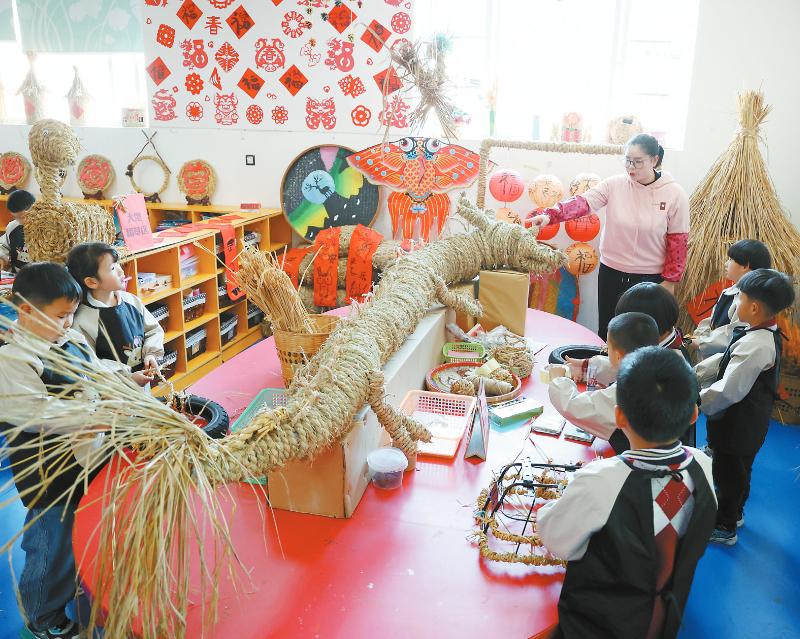 永定鳳城中心幼兒園注重開展在鄉土文化中融入勞動教育的實踐研究,根據幼兒的實際生活經驗,把各種社會勞動角色及基本勞動技能融入到實踐操作和游戲中,讓幼兒體驗到勞動和創造的快樂,如讓孩子們學習古人夯墻、建造“土樓”、搭建“龍湖大橋”等。圖為孩子們學習稻草編織傳統工藝。 曾志明 蘇曉娟 攝