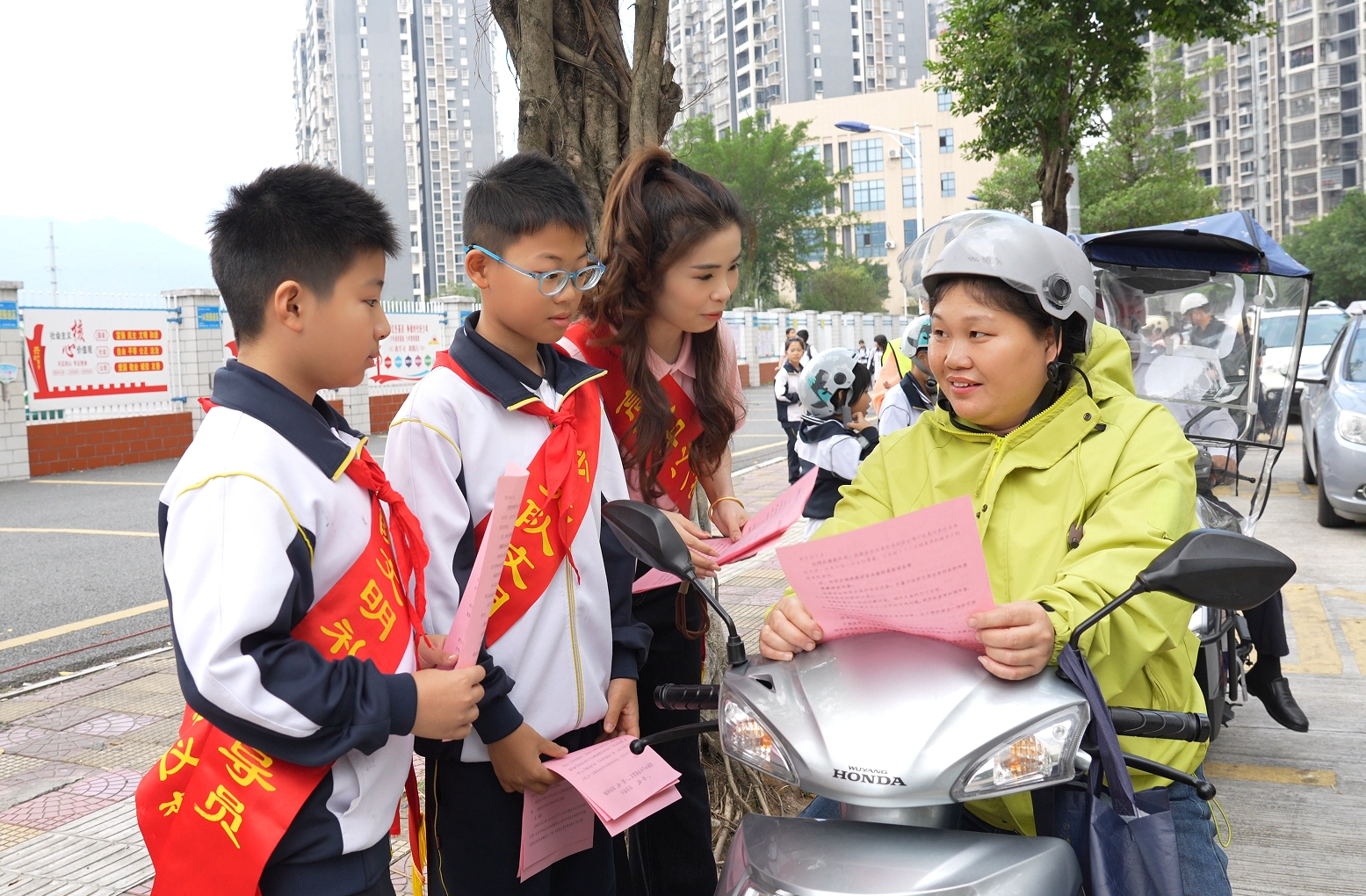 高陂中心小學(xué)開展佩戴安全頭盔文明勸導(dǎo)