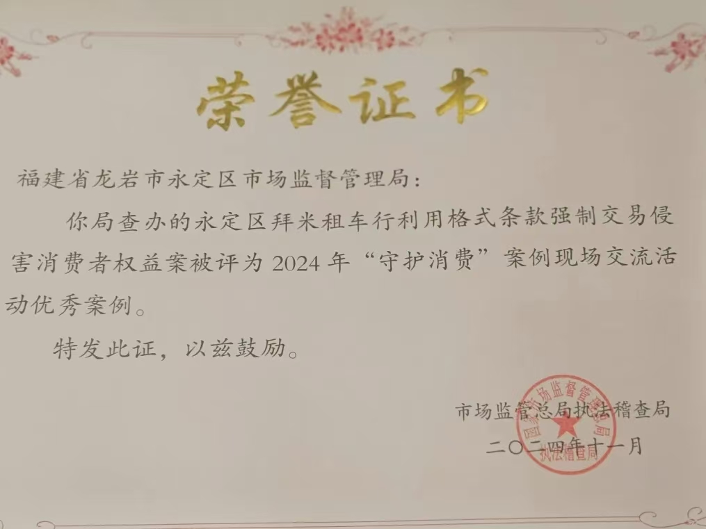 據(jù)介紹,永定區(qū)拜米租車行當(dāng)時作為城區(qū)唯一的共享自行車運營商,設(shè)置“免押金服務(wù)”項目,以免押金卡的方式收費,同時采用預(yù)付資金的形式開展租賃活動,設(shè)置最低充值額且未設(shè)置退款路徑,購買免押金卡也不是開展租賃活動的必要條件,其以拒絕或中斷租賃服務(wù)的方式,通過其用于開展租賃活動的APP和小程序的格式條款設(shè)定,排除消費者的自主選擇權(quán),迫使消費者在租賃過程中接受其加重消費者責(zé)任和減輕經(jīng)營者責(zé)任的不公平規(guī)定,構(gòu)成了強制消費的行為。經(jīng)查,永定區(qū)拜米租車行在2019年7月12日至2021年8月1日期間的違法所得為829796.3元。 投訴舉報處理工作事關(guān)群眾切身利益,事關(guān)良好營商環(huán)境和消費環(huán)境,直接影響人民群眾滿意度。“永定區(qū)拜米租車行利用格式條款強制交易侵害消費者權(quán)益案”的查辦過程中,永定區(qū)委、區(qū)政府高度重視,堅持以人民為中心,心系群眾利益,對侵害群眾利益的違法行為“零容忍”,要求區(qū)市場監(jiān)管部門依法依規(guī),用心用情,維護市場秩序清朗規(guī)范,打造更優(yōu)營商環(huán)境,讓人民群眾的獲得感、幸福感和安全感更強。 近年來,永定區(qū)市場監(jiān)管局立足職責(zé),積極作為,聚焦“民意最盼、危害最大、市場監(jiān)管風(fēng)險和壓力最大”的重點領(lǐng)域,以“點題整治”和“鐵拳行動”涉及案件為重點,堅持“有訴必接、快速反應(yīng)、及時處置、服務(wù)為民”的理念,密切關(guān)注侵害消費者權(quán)益違法行為的新動態(tài)、新特點,強化執(zhí)法隊伍建設(shè)和專業(yè)人才培訓(xùn),運用信息技術(shù)提升監(jiān)管執(zhí)法效能,持續(xù)深化專項行動成果。 “永定區(qū)拜米租車行利用格式條款強制交易侵害消費者權(quán)益案”參評取得優(yōu)異成績,就是對永定區(qū)市場監(jiān)管系統(tǒng)執(zhí)法工作的認(rèn)可,為進一步推動打擊消費侵權(quán)違法行為、增強消費者法治意識和完善監(jiān)管機制提供了強大動力。區(qū)市場監(jiān)管部門表示,將繼續(xù)加強執(zhí)法監(jiān)管,扎實推進消費者權(quán)益保障,有力守護公平競爭的市場秩序和營商環(huán)境。 ★★ 兵民一家★★ 永定工業(yè)園區(qū):“幫代辦”讓政務(wù)服務(wù)有“速度”更有“溫度” 11月11日,永定工業(yè)園區(qū)管委會干部吳煌榮在區(qū)政務(wù)服務(wù)中心窗口為入駐企業(yè)龍巖暉通新材料科技有限公司代辦理營業(yè)執(zhí)照等相關(guān)證件,讓政務(wù)服務(wù)有“速度”更有“溫度”。
