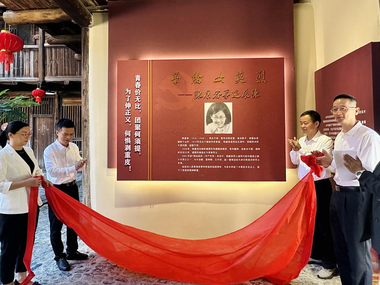 ▲ 11月8日,“華僑女英烈——陳康容事跡展陳”在永定區(qū)岐嶺鎮(zhèn)下山村望森樓揭牌。展陳通過實物還原、圖片文字記載和多媒體影像展示等方式,生動再現(xiàn)陳康容積極投身抗戰(zhàn)的愛國史。岐嶺鎮(zhèn)將努力把展陳打造成為永定區(qū)聯(lián)系歸僑僑眷的新載體,展示華僑風(fēng)貌的新窗口,傳播華僑文化的新平臺。區(qū)領(lǐng)導(dǎo)邱小洪、林壽楊、盧連芳參加活動。