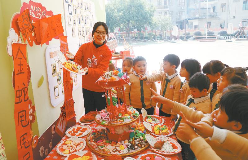 新春佳節(jié)將至,近日,為聚焦“兒童親歷真實(shí)的生活”課程理念,永定區(qū)第二實(shí)驗(yàn)幼兒園以“年味”為主線,開展“尋找非遺里的中國年”活動。孩子們化身小小傳承人,拓印福字、窗花剪紙、書寫楹聯(lián)、制作花燈等,忙碌著為幼兒園喜“添”年味,和和美美迎新春。圖為老師向孩子介紹過年的客家美食。 曾志明 徐曉萌 攝