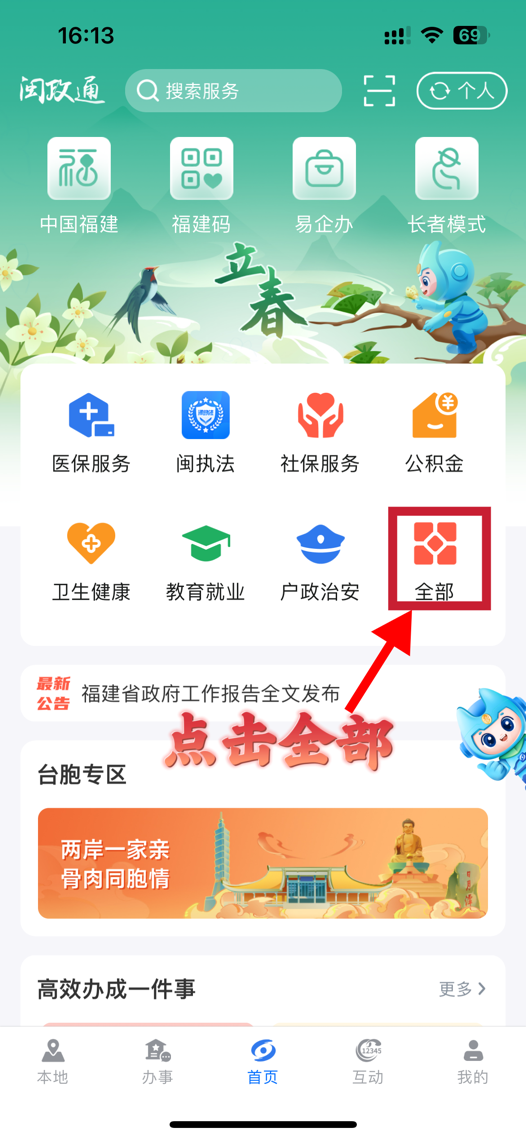 視頻加載中... 一、養(yǎng)老金待遇領(lǐng)取資格認(rèn)證對(duì)象 2024年12月31日前已辦理退休手續(xù)并在龍巖市永定區(qū)機(jī)關(guān)社保中心領(lǐng)取養(yǎng)老金的退休(職)人員。 二、認(rèn)證時(shí)間 2025年1月1日至12月31日 三、認(rèn)證渠道 (一)自助人臉識(shí)別認(rèn)證 通過手機(jī)下載安裝“閩政通”APP并注冊登錄(同一個(gè)“閩政通”賬號(hào)可為多人認(rèn)證)。 “閩政通”自助認(rèn)證具體操作如下: 1.打開“閩政通” APP 頁面,首頁點(diǎn)擊進(jìn)入“全部”。