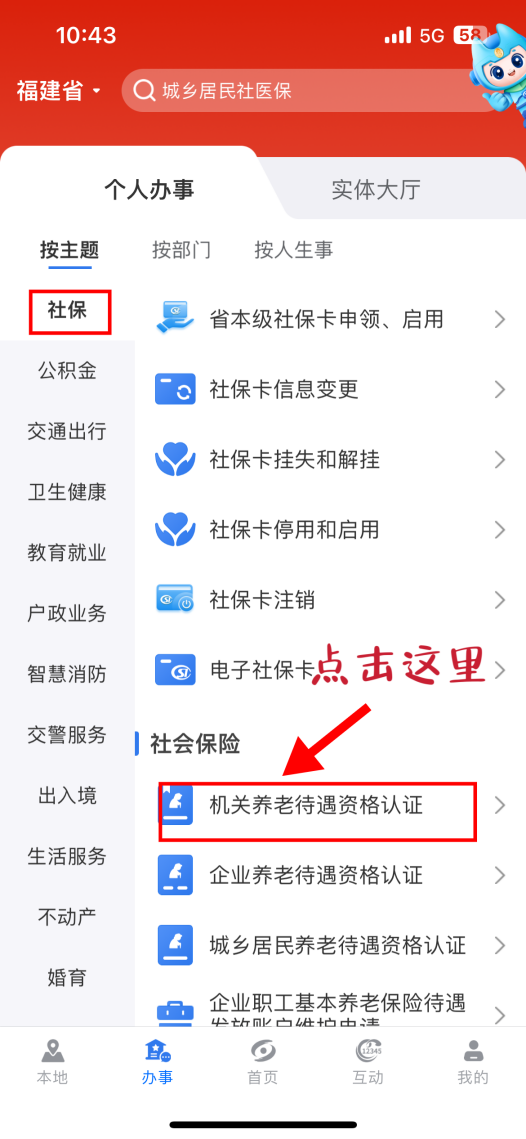 2.點(diǎn)擊“社保”頁面,再點(diǎn)擊“機(jī)關(guān)養(yǎng)老待遇資格認(rèn)證”
