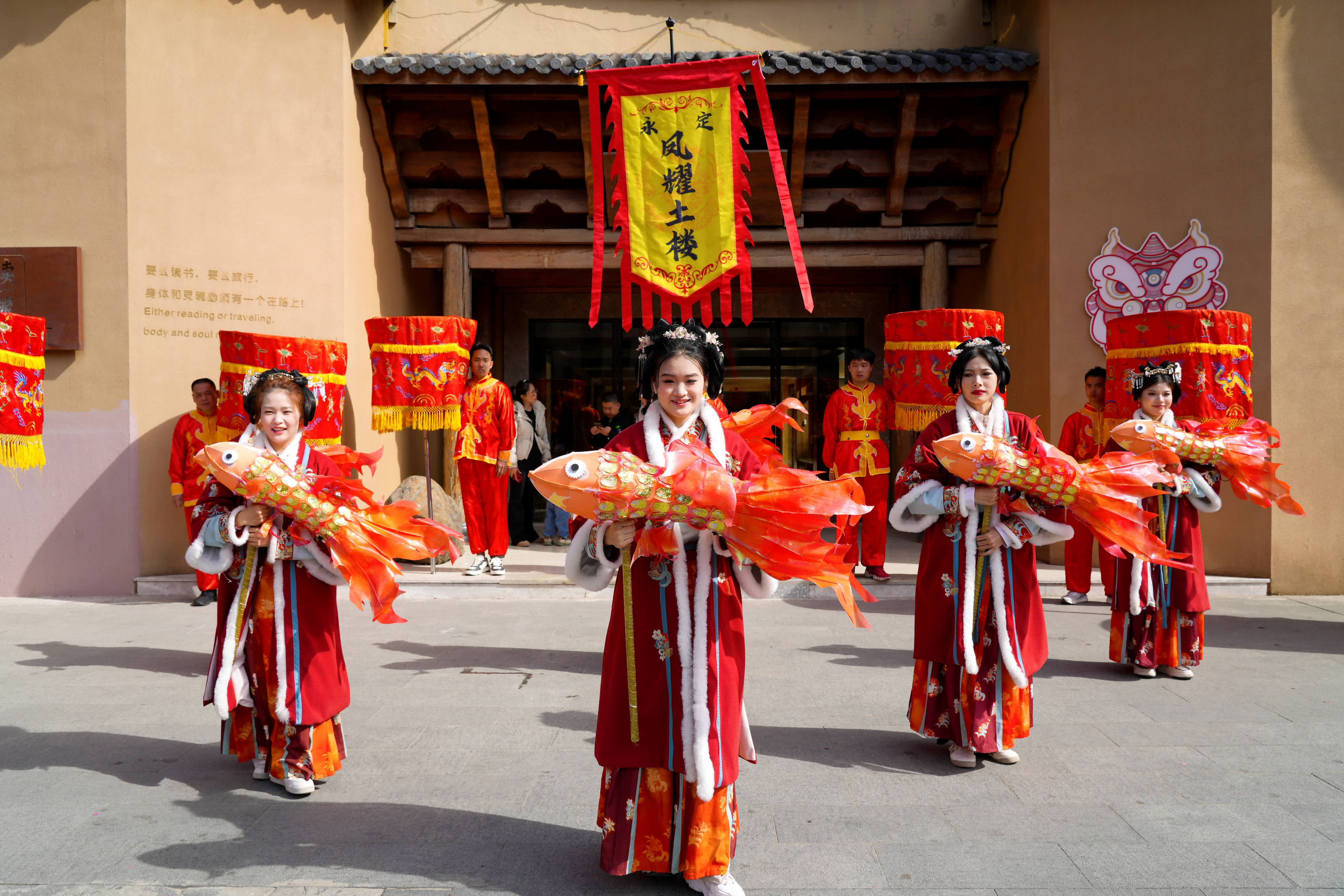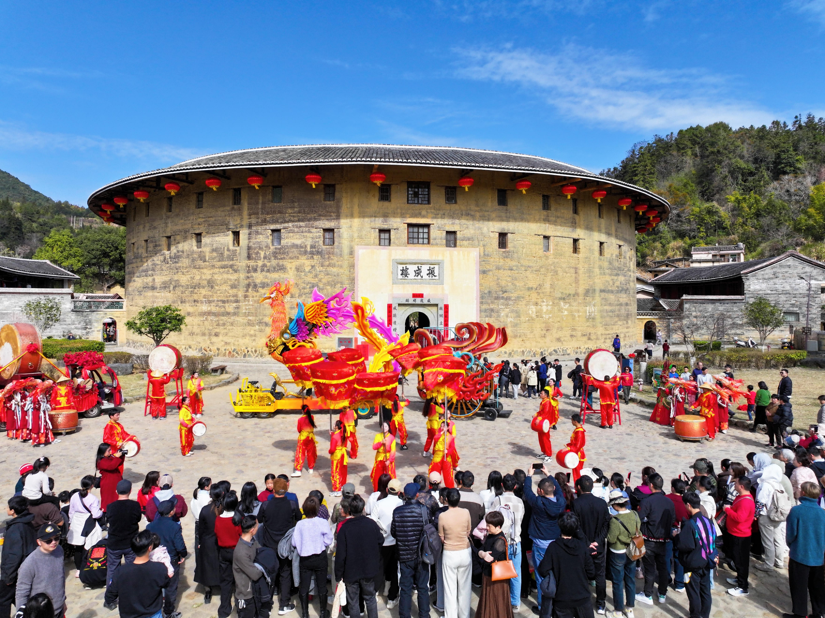 巨型彩翼靈鳳、圣甲戰(zhàn)神軍團(tuán)、非遺魚(yú)燈、大鼓涼傘、舞龍舞獅、《土樓有喜》客家婚俗表演……在洪坑土樓民俗文化村,景區(qū)精心組織的“永定土樓過(guò)大年”主題活動(dòng)讓游客感受了別樣的年味。