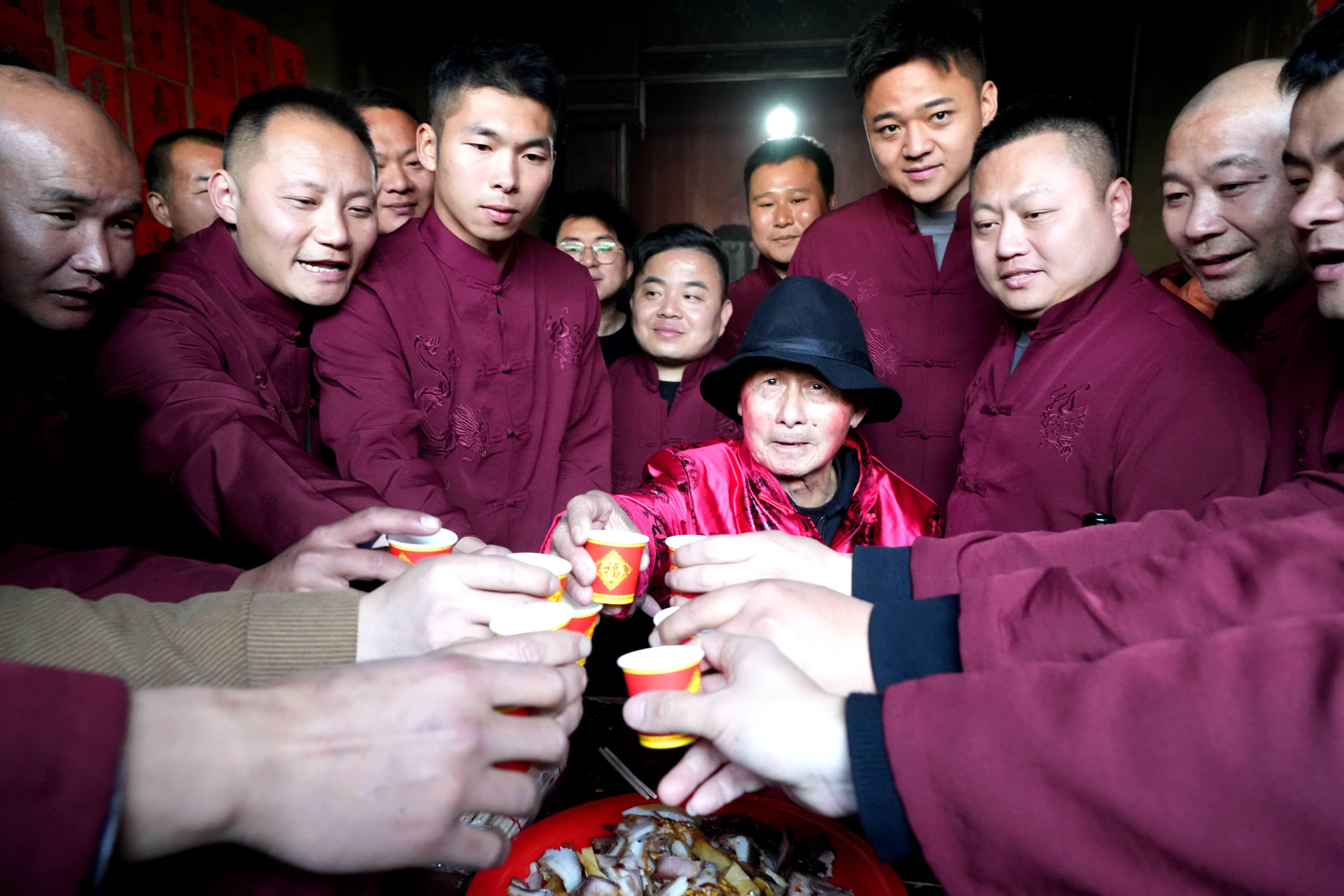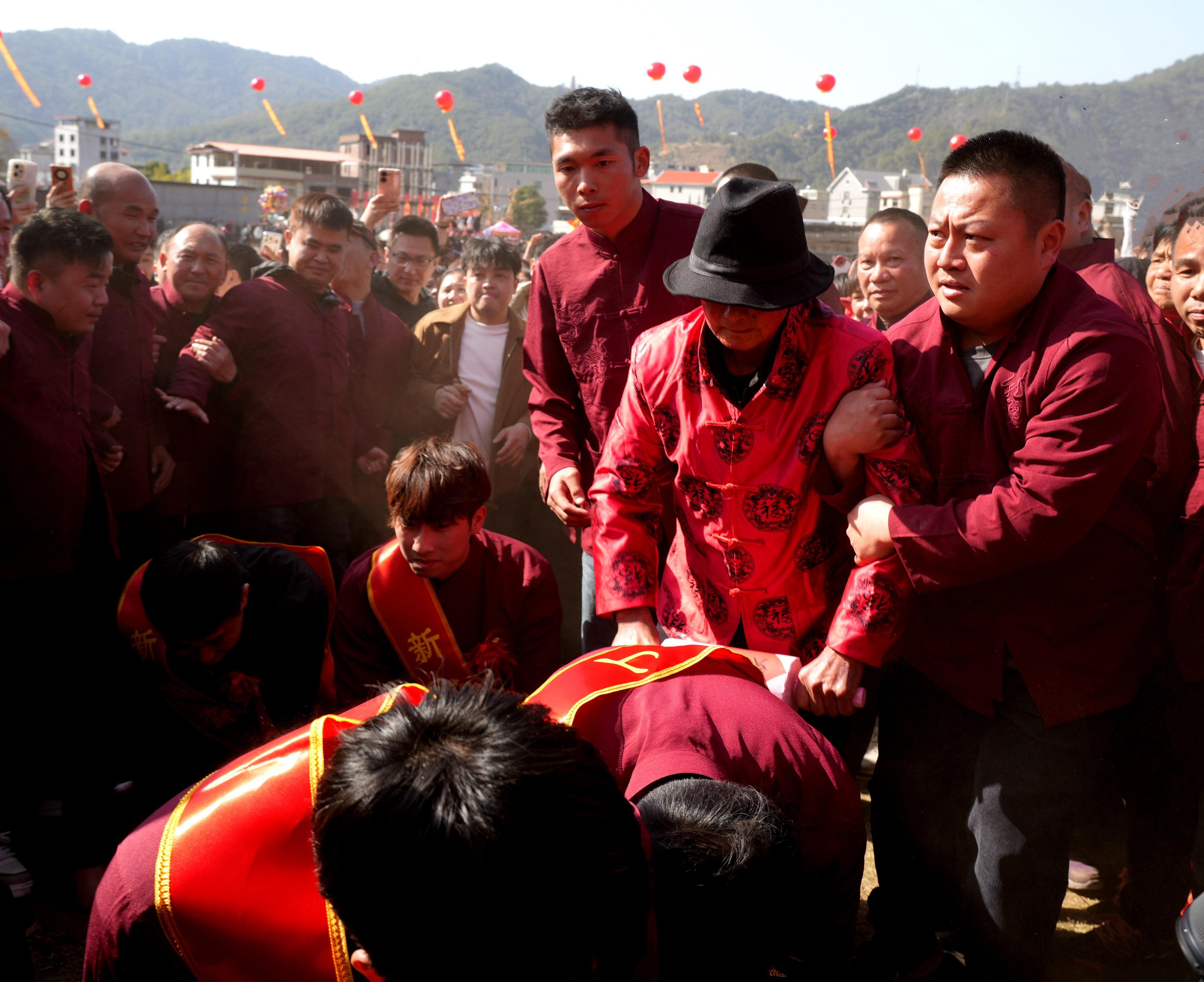 “小的時候特別羨慕被打的人,今天終于輪到我啦!我剛被‘酒醉公’打了好幾下,真的是太開心啦!希望今年能添丁添財,萬事如意。”坎市鎮(zhèn)坎市街社區(qū)日新片五房新郎官盧建榮說。