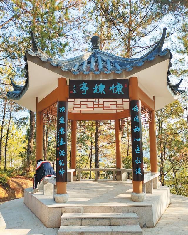 圖為懷楝亭 ■劉永良 文/圖 龍巖市永定區城關中學有一座“學子崠文化公園”。我對“學子崠”這個名稱頗感興趣,心里早已產生欲探其究的愿望。 抬頭仰望,“學子崠文化公園”所處的山坡地勢平緩,但卻以“崠”命名,我想應該有一番深意。據說,公園揭牌時主持人闡釋了命名的含義,期望公園能給大家帶來快樂與靈感,“珍惜學習機會,腳踏實地,不斷超越自我,攀登人生的新高峰?!?/span> “崠”作為山峰或山脊的代名詞。在古代,山峰常被視為神圣之地,因此“崠”字承載了這種文化符號,象征著堅毅、崇高和不懈奮斗的精神。在實際生活中,“崠”字也被用作地名,通常位于山地或高地,反映了古人對自然環境的理解和尊重。 我們一行4人從運動場看臺旁的入口登臨公園,一路景色漸次展開。首先映入眼簾的是一排“登高詩詞薈”,鐫刻了10多塊古代詩詞書法作品,涵蓋篆、隸、楷、行、草5體。“詩為心聲,書為心畫?!边@些作品,既是對古典詩詞的傳承,也是對詩詞意境的別樣解讀。 我們邊走邊聊,沿著“永定紅”石板材鋪就的登山步道拾級而上,仿佛走進了一座天然的大氧吧,忍不住深呼吸。公園里那一株株傲然挺立的松樹是一道獨特的風景,即使在寒冷的冬季也保持郁郁蔥蔥的色彩。陽光透過斑駁的樹影,灑在蜿蜒的小徑,形成一片片金色的光芒。還有,公園里播放著歡快輕松的音樂,讓我們在欣賞美景的同時,也沉浸在美妙的愜意之中。 行走到大約20來米的地方,一座亭子矗立在眼前,幾位學子坐在亭中。這座由1992屆高中畢業校友敬建的“懷楝亭”,上書一副楹聯:“懷有初心匡社稷 楝盈紫氣滿乾坤”?!巴ぶ粦验??!币慌缘氖獭皯验び洝庇嗅?。同行的一位老師打趣地說:“苦楝‘苦練’,‘懷楝亭’時時提醒我們要像苦楝樹一樣,不嫌棄腳下土地的貧瘠,艱苦磨煉,頑強生長。” 越往山上走,景色越發壯觀。微風拂面,送來草木的芬芳。側耳傾聽,那風穿過林梢的沙沙聲,似是學子們的瑯瑯書聲。到達山頂,又見一座綠蔭掩映下的山亭,名曰“上下亭”。亭柱上的楹聯“上求天心 下接地氣”,旨在鼓勵人們自強不息、勤勉不懈,關注現實生活、肩負社會責任。 極目遠眺,百里山川、鄉野風情盡收眼底,頗有一覽眾山小的登天之感,令人心曠神怡。 沿著石階路往下走到一平坦處,便可在路旁看見“敢問亭”。從亭子向四周望去,看到的景色各不相同。亭柱上鐫刻的楹聯:“立品修身問青云三德具備 齊家治國平天下一理貫通”。細細品味,這副楹聯藏著大學問。其一,儒家主張“天下為公”,人們應該共擔社會責任;其二,由個人而家:國、天下,由身修到家齊、國治天下平,這是一個具有內在邏輯聯系的過程。怎樣修身?《大學》給出的方式是:格物、致知、誠意、正心。修“身”落腳于修“心”,由此提高品德修養,整齊家族家庭,實行位政德治,最終求得天下太平。 在“敢問亭”,我靜靜地佇立,回味著登山的過程,心中翻涌著無盡的感慨。登臨“學子崠”,不僅是一次身體的鍛煉,更是一次心靈的洗禮。它讓我懂得了,在人生的道路上,只要懷揣堅定信念,勇往直前,就能夠跨越一個一個臺階,領略到最美的風景。特別是這三座亭子,不僅造型美,更有一種文化意境的美,每座亭子都有獨特的韻味與情調。正所謂:亭者,停也;亭,是停下來看風景;亭,是停下來修心境。 |