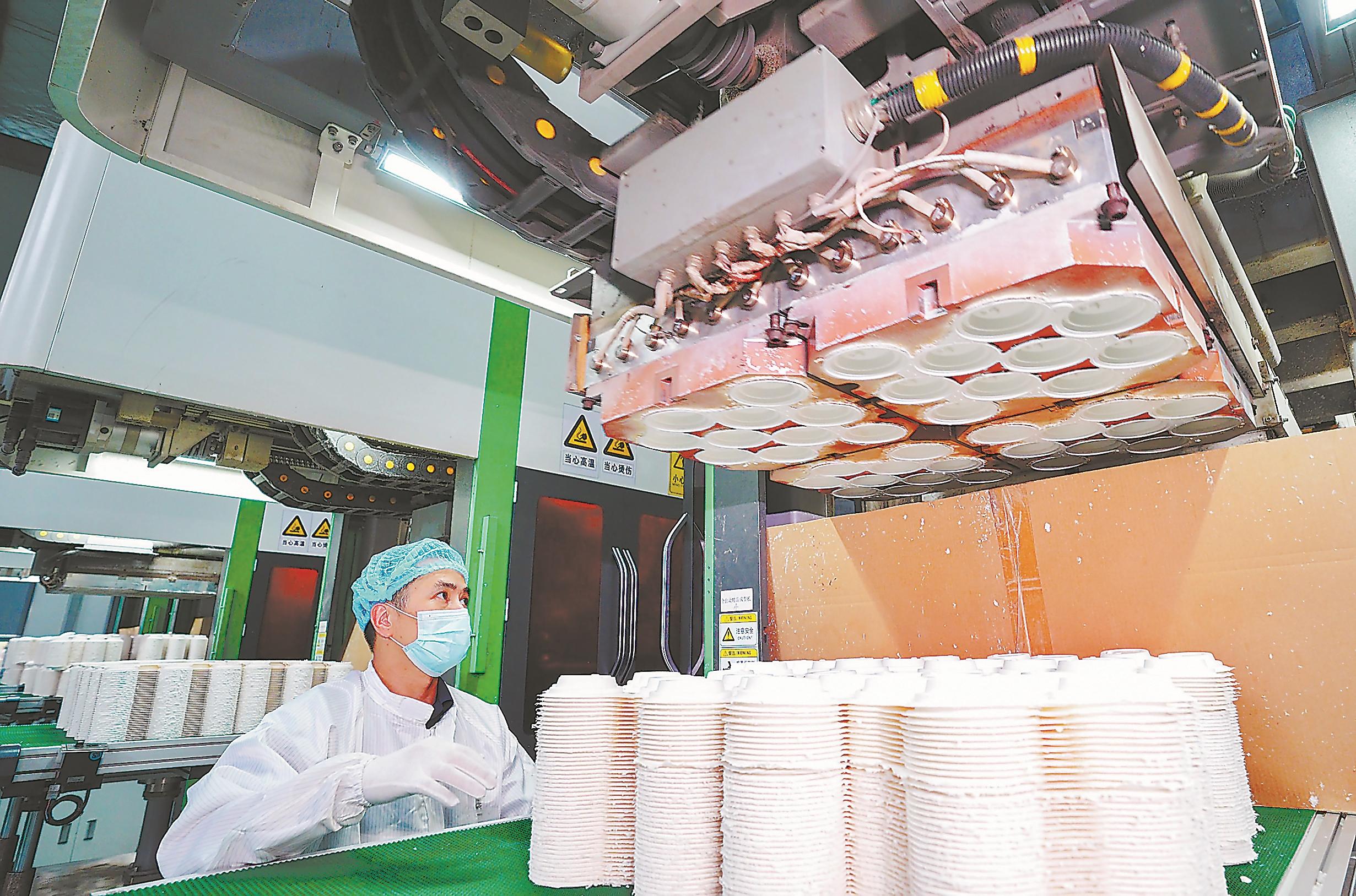 連日來,位于龍巖市永定工業園區的龍巖青橄欖環保科技二期項目的廠房內,工人正在近期新增的智能生產線上制作可降解環保一次性餐盒(如圖)。今年來,企業迅速調整策略,擺脫去年國際訂單波動的影響,一方面深耕歐洲市場,另一方面拓展國內餐飲連鎖客戶,產品訂單量逐漸增加,已排至年底。