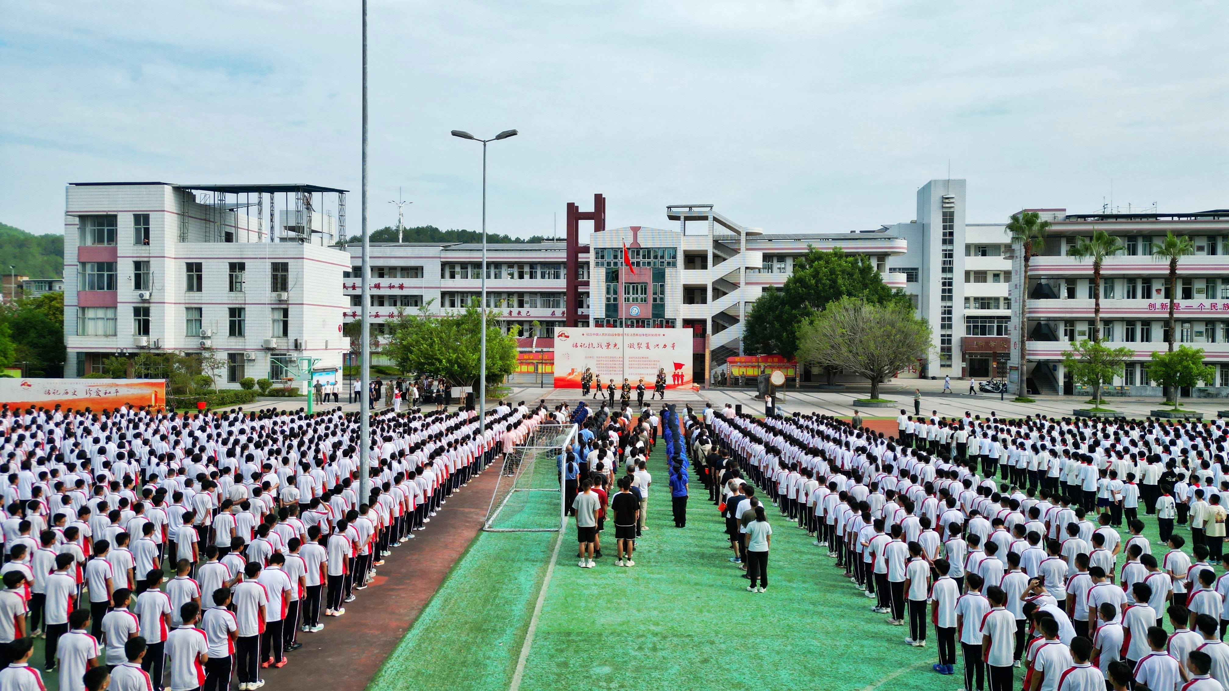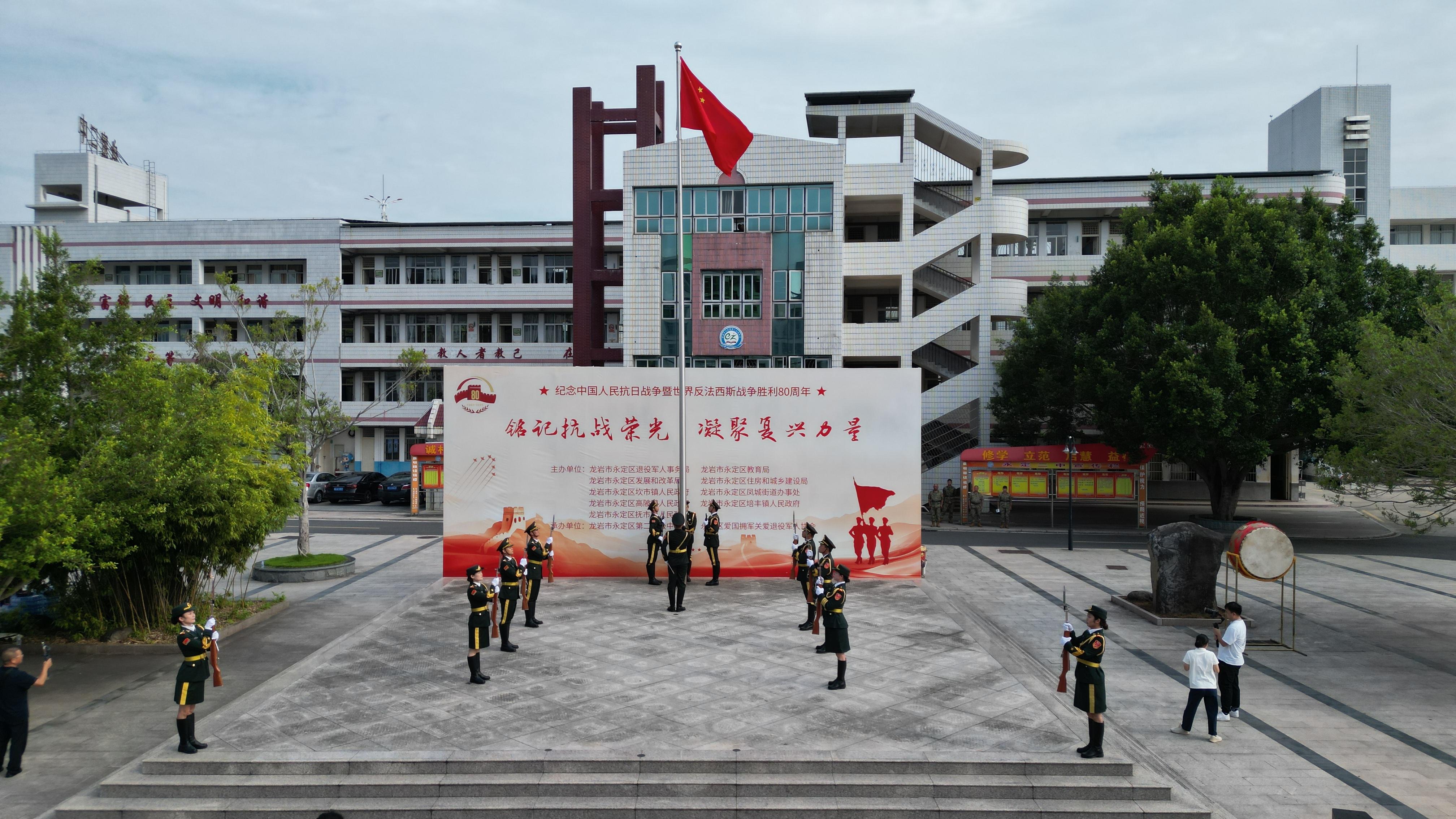8時30分,活動在《義勇軍進行曲》中啟幕。由退役軍人組成的“尊崇向陽”國旗護衛隊以標準軍事動作完成升旗儀式,全場齊聲高唱國歌。 驟然響起的客家大鼓聲打破寂靜,現場以《抗戰凱歌》非遺表演再現閩西兒女抗戰場景。5名抗日英烈親屬代表登臺,接受獻花。隨后,社會各界代表們舉起握緊拳頭的右手,高呼“以史為鑒,振興中華”誓詞,鏗鏘有力的聲音與《歌唱祖國》的旋律交織,回蕩在校園上空……