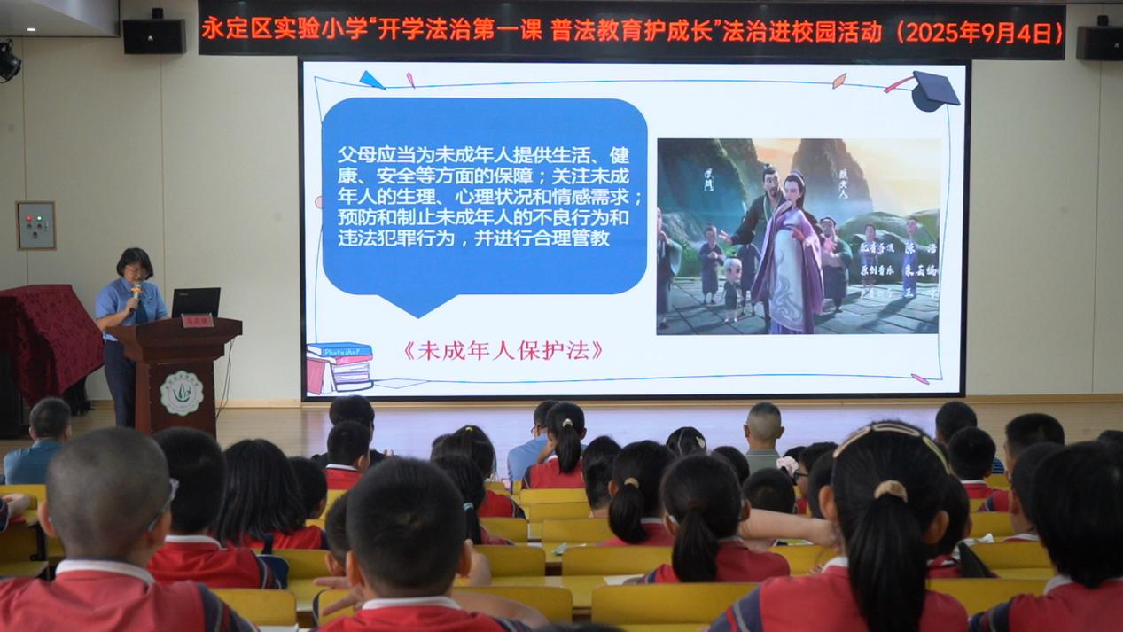 9月4日上午,永定區實驗小學開展“護苗在行動 法治伴成長”為主題的進校園活動。區委宣傳部、區人民檢察院等多家單位聯合發力,通過法治授課、材料發放、周邊檢查等形式,為全校學生送上了一份特殊的“開學禮”。