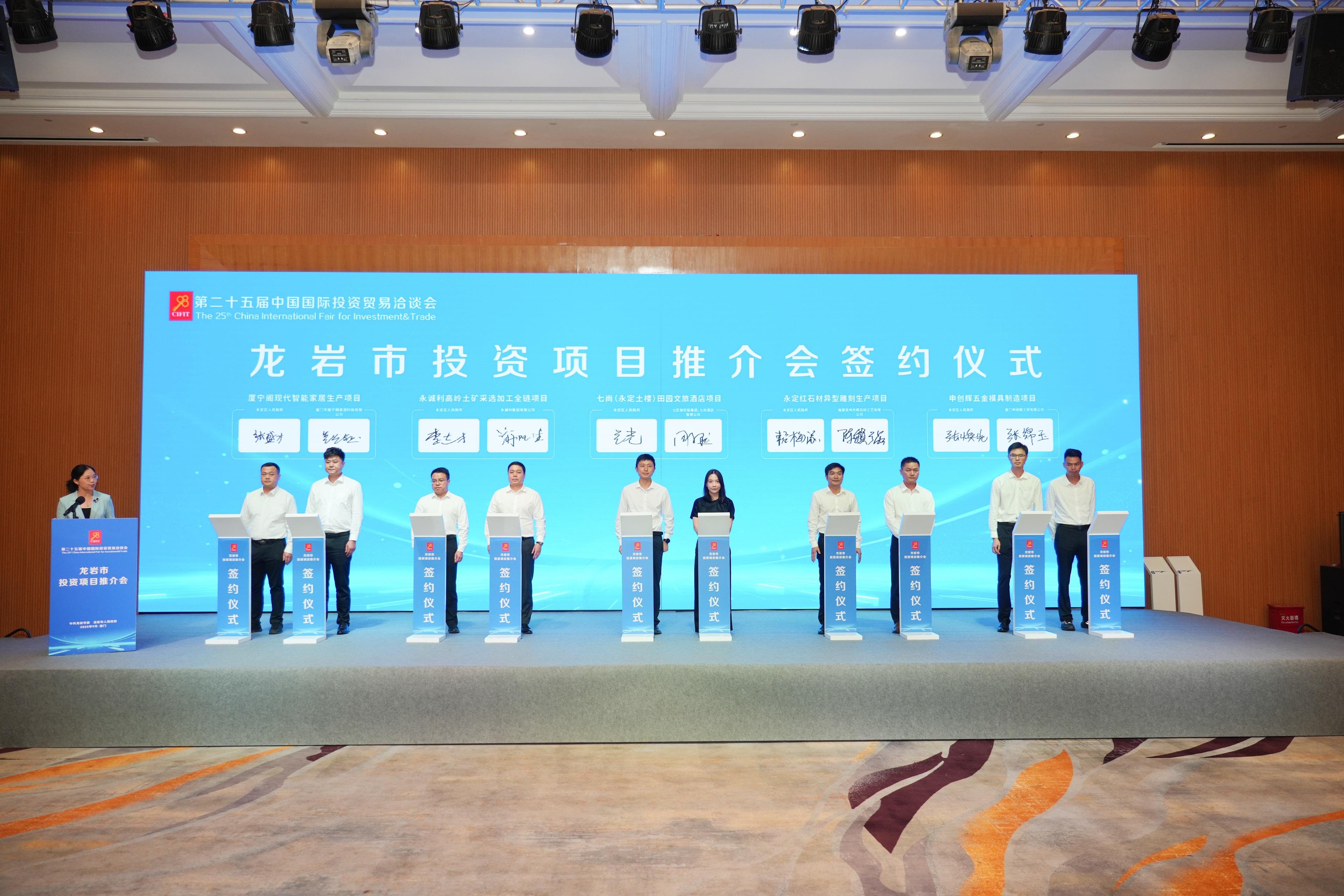 在9月7日下午舉行的龍巖市投資項目推介會上,永定區代表團上臺簽約項目5個,分別為永誠利高嶺土礦采選加工全鏈項目、七尚(永定土樓)田園文旅酒店項目、永定紅石材異型雕刻生產項目、廈寧閣現代智能家居生產項目、永定區申創輝五金模具制造項目,涉及工業、農業服務業等項目,總投資13.15億元。此次簽約項目落地后,將推動永定區產業結構優化升級,助力鄉村振興與文旅經濟深度融合,為區域高質量發展注入強勁動能。