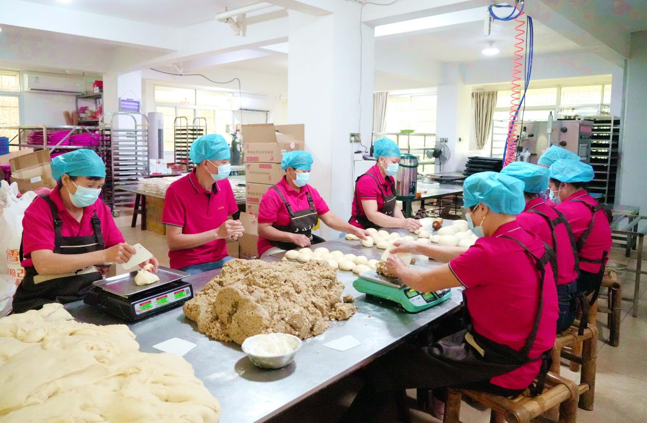 9月25日,高陂奇奇食品廠的生產車間里一派繁忙。60歲的糕點師傅蔡壯偉帶領十多名工人加緊趕制訂單,從調配餡料、和面、包餡,到壓模、烘烤,每道工序都延續著手工傳統。剛出爐的月餅色澤金黃、香氣四溢。 “我們線上線下同步銷售,最遠的訂單寄到內蒙古,每天生產3000多個仍供不應求。”蔡壯偉笑著說道。從業四十多年來,他始終堅守傳統工藝,從選料到制作全程嚴格把控,在保留傳統餡料與和面方式的同時,也引入現代烘焙與包裝技術,既留住老味道,也延長了產品保質期。