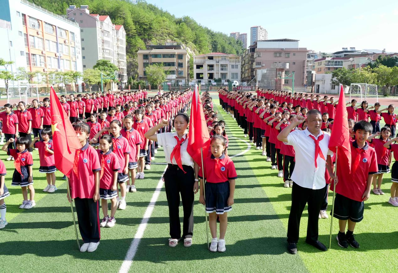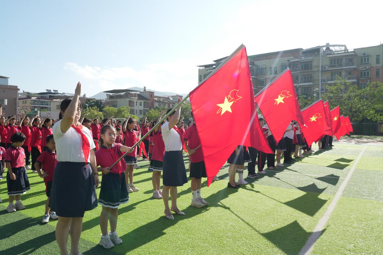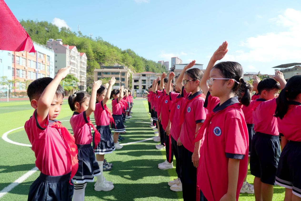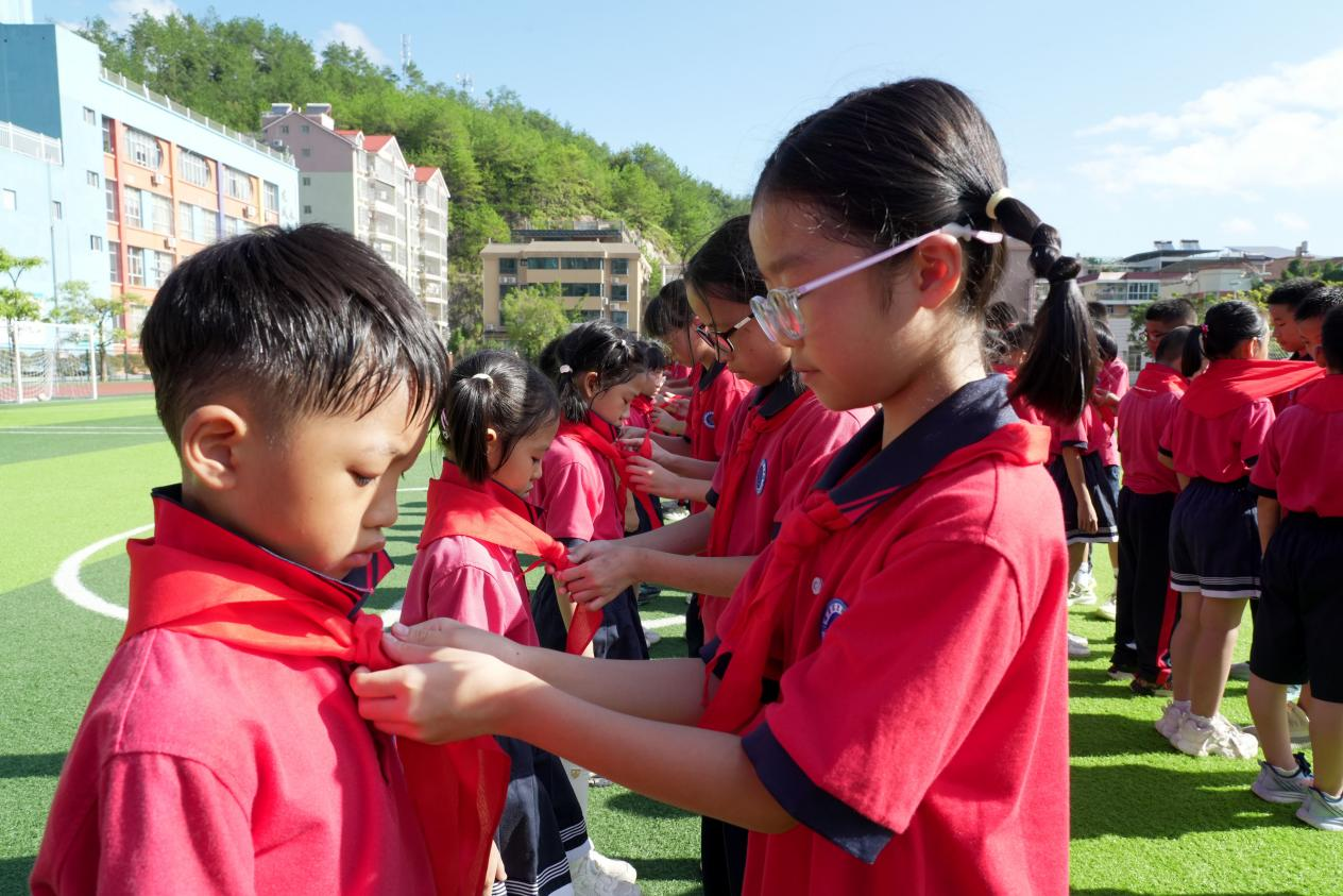在莊嚴的《出旗曲》中,旗手步伐鏗鏘,護送隊旗入場,全體少先隊員凝神肅立,目光追隨著鮮艷的隊旗,鄭重敬起隊禮;《中國少年先鋒隊隊歌》響徹校園,同學們用嘹亮歌聲傳遞前進信念,稚嫩嗓音里滿是少年朝氣。校領導、輔導員與老隊員們手持紅領巾,鄭重為新隊員佩戴——當紅色三角巾在胸前展開、系緊,榮譽與責任的種子也隨之扎根,新隊員眼中閃爍的自豪光芒,成為現場最動人的風景。隨后,新隊員們在大隊輔導員的帶領下高舉右拳,面對隊旗莊嚴宣誓,“愛黨、愛國、愛人民”的誓言雖輕,卻字字鏗鏘,深深烙印在每顆少年心中。