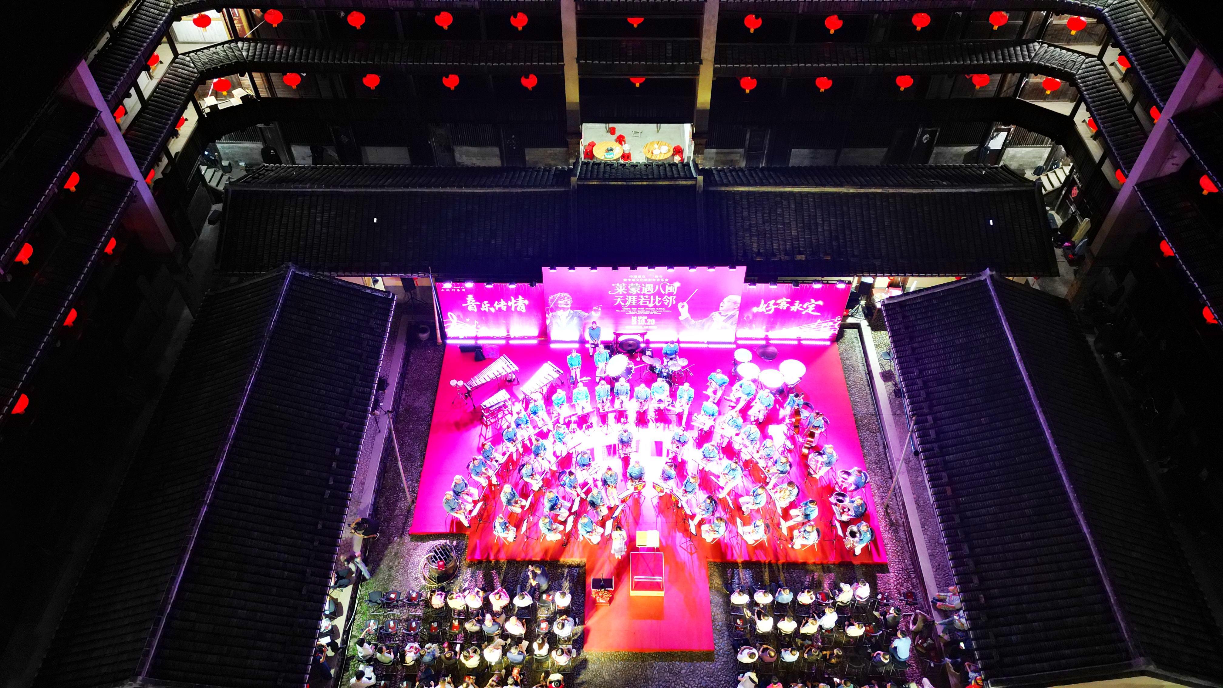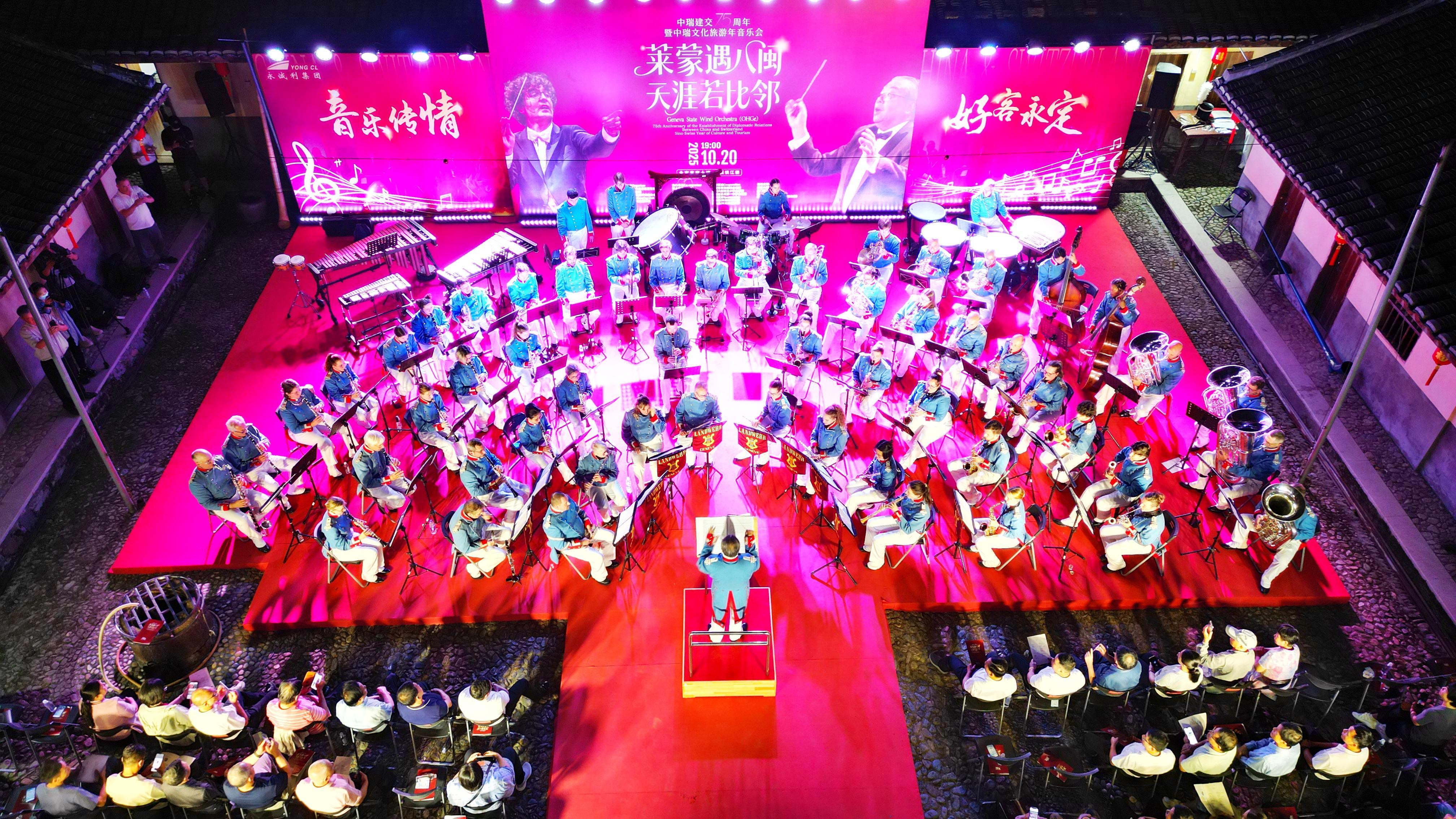 10月20日晚,福建省永定區大溪鄉的鎮江樓內燈火通明,一場以“土樓為幕、音符為橋”為主題的交響音樂會在此隆重上演。來自瑞士日內瓦州立管樂團的70余名音樂家,以中西合璧的演奏獻禮中瑞建交75周年暨中瑞文化和旅游年,為現場觀眾帶來一場跨越8000公里的藝術盛宴。 音樂會在《歡迎進行曲》中拉開帷幕,由瑞中文化藝術交流協會會長、指揮家趙元與瑞士指揮家讓-克里斯托夫·莫尼耶聯袂執棒。隨后,中瑞兩國國歌的旋律在土樓穹頂下莊嚴奏響,觀眾自發起立合唱,掌聲雷動。樂團還演繹了《紅旗頌》《鼓浪嶼之波》等中外經典曲目,既有恢宏的革命敘事,亦有婉轉的地域情懷,展現出音樂跨越國界的感染力。
